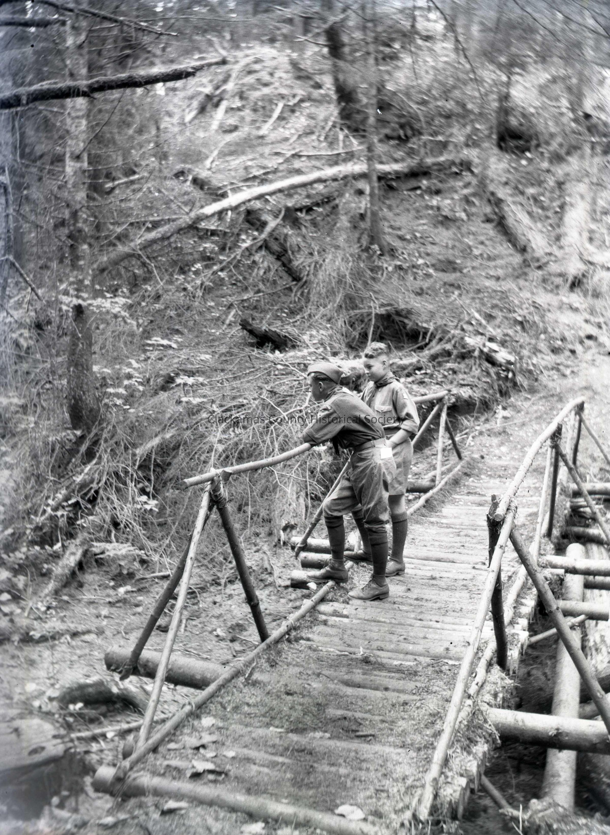 Pioneer Bridge Boy Scout Camp Merriwether, Oregon - Negative. Two unidentified Boy Scouts on the bridge