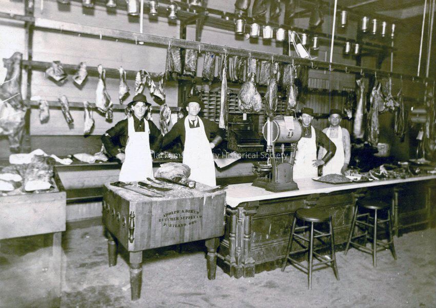 Photograph of the interior of the "Pioneer Market". Located at 5th and Main Street, Oregon City, Oregon. 1908. The workers in store posing behind meat counter. From the meat hanging and the butcher block it seems to be a meat market.Made/Created