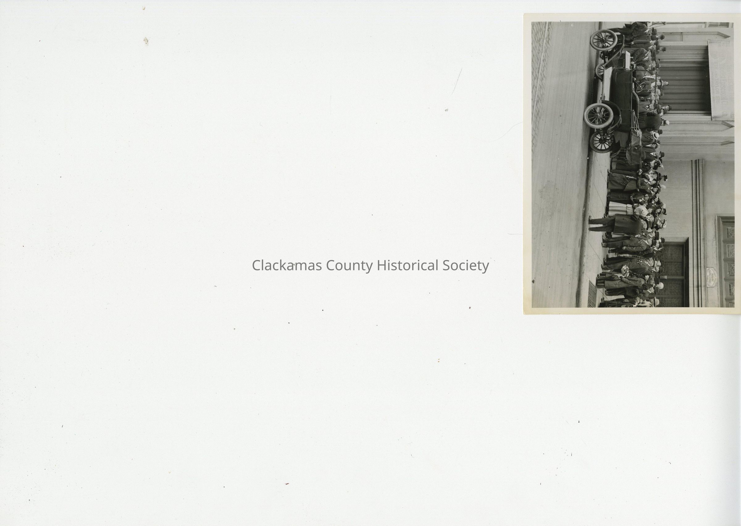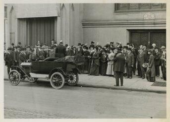 A crowd of people are out in front of the church listening to a man speak. An automobile is in the foreground.