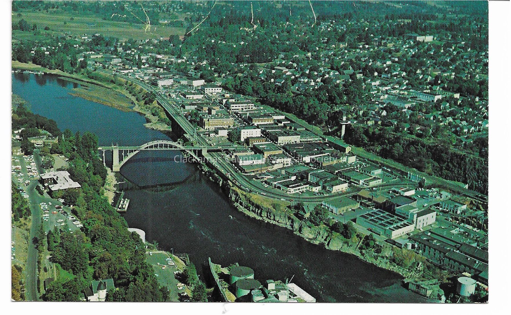 Post card with an above view of Oregon City. Likely taken from an aircraft. Colors faded out from age. No date