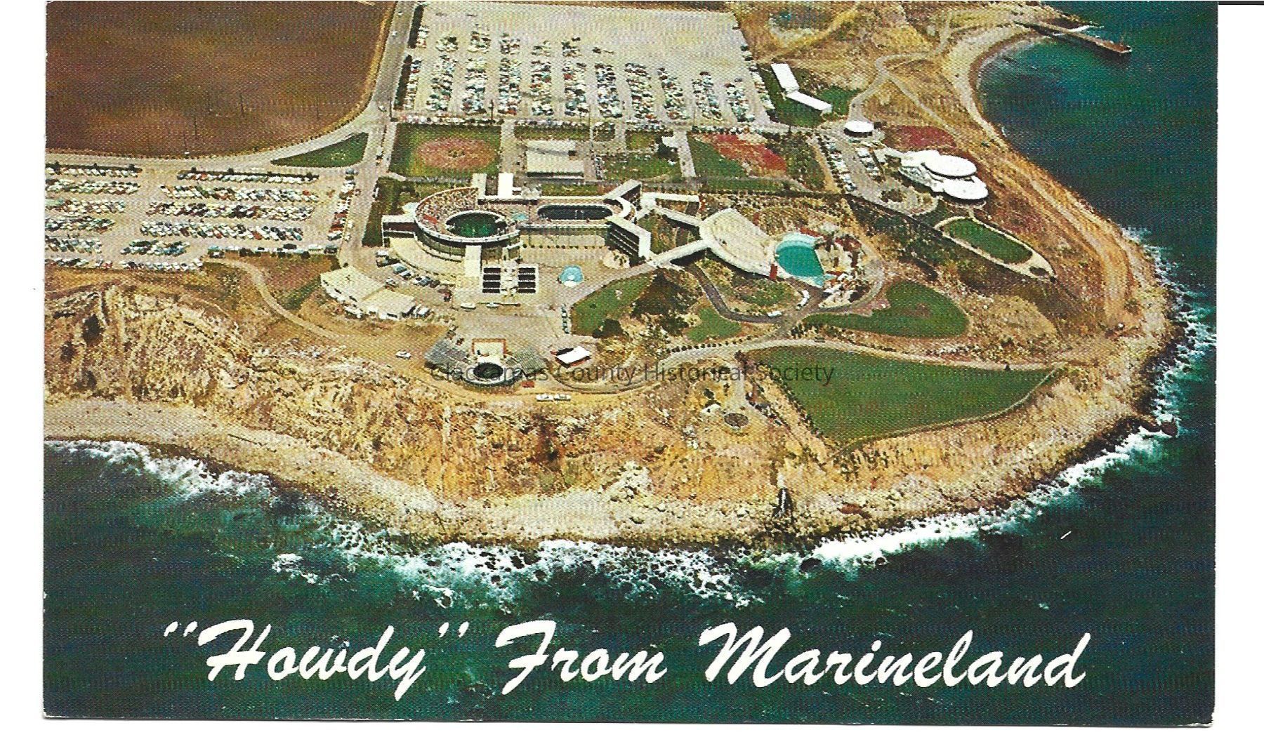 Picture is an aerial shot of Marineland. With "Howdy" From Marineland written on the bottom