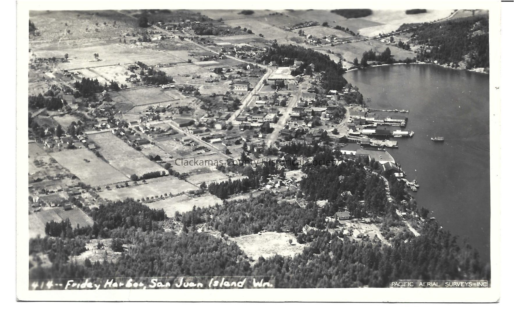 This item is a postcard from Norman Hunter from San Juan Island Washington. Picture on front is an air view of Friday Harbor, San Juan Island Wa.