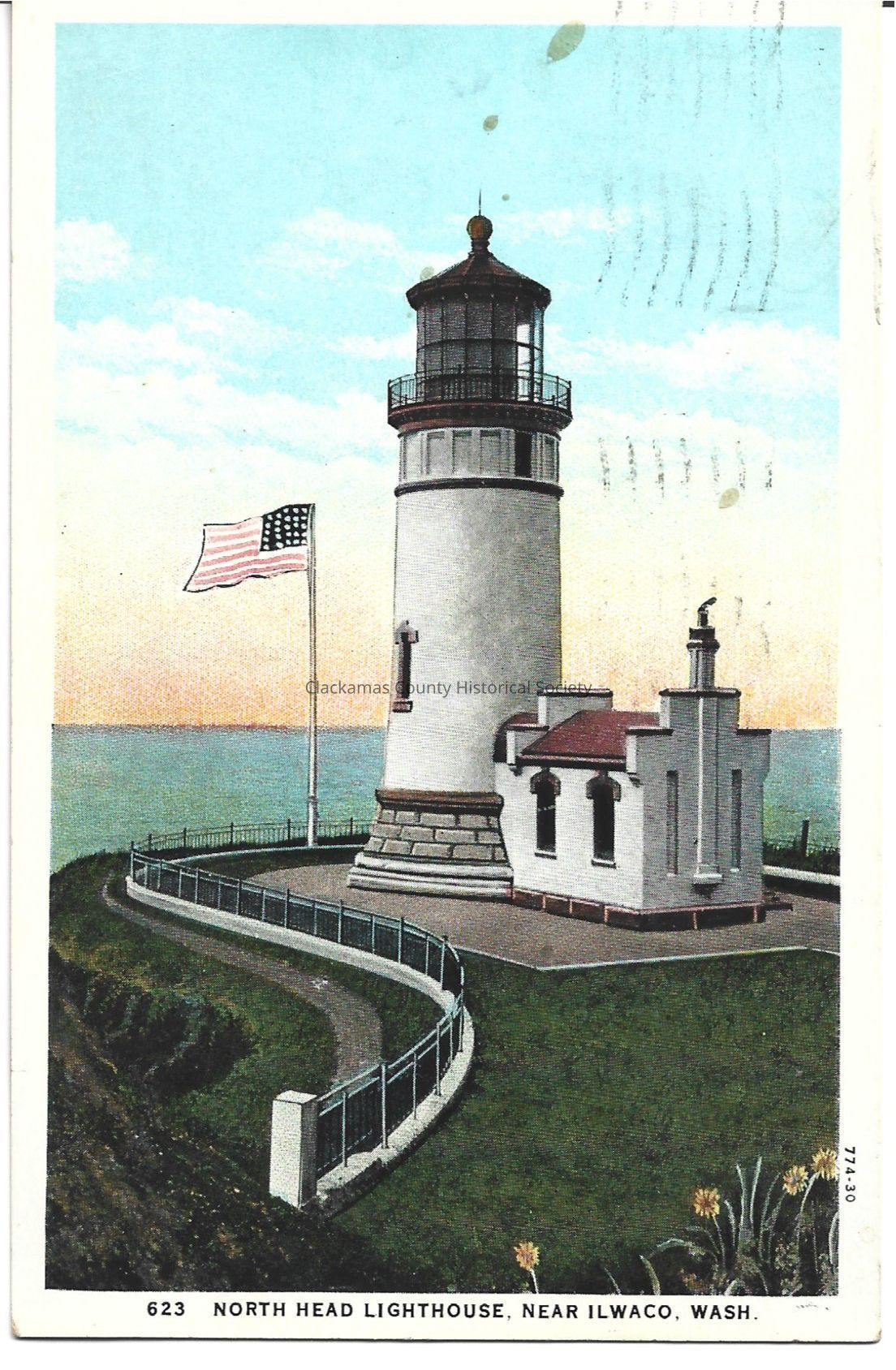 This item is a postcard from Norman Hunter from Gearhart Oregon. Picture of lighthouse near Ilwaco, Washington on the front. Picture appears to be a sketch taken from a photograph.