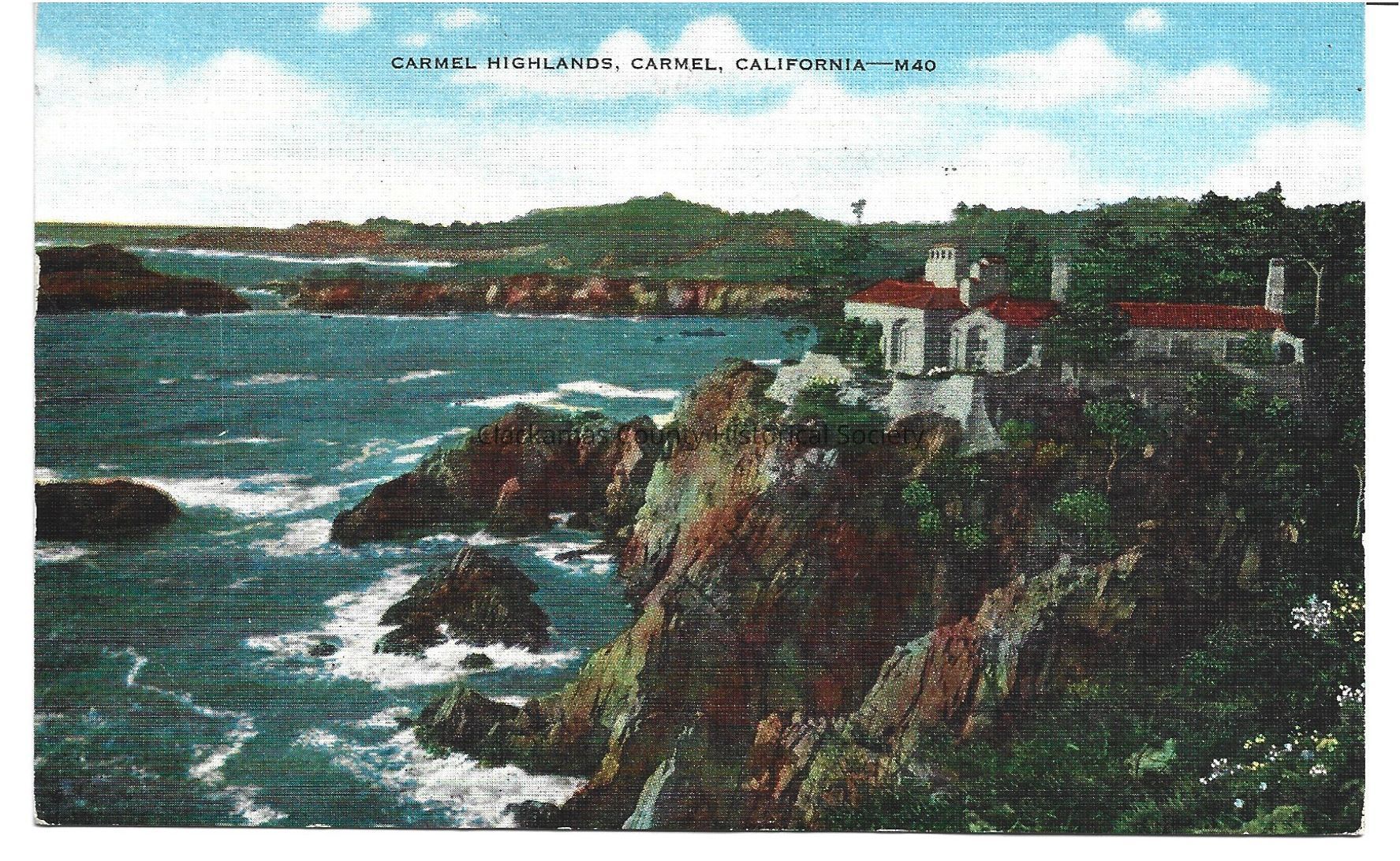 This item is a postcard from Norman Hunter from Carmel California. Picture on front of Carmel Highlands appears to be a sketch from an original photograph.