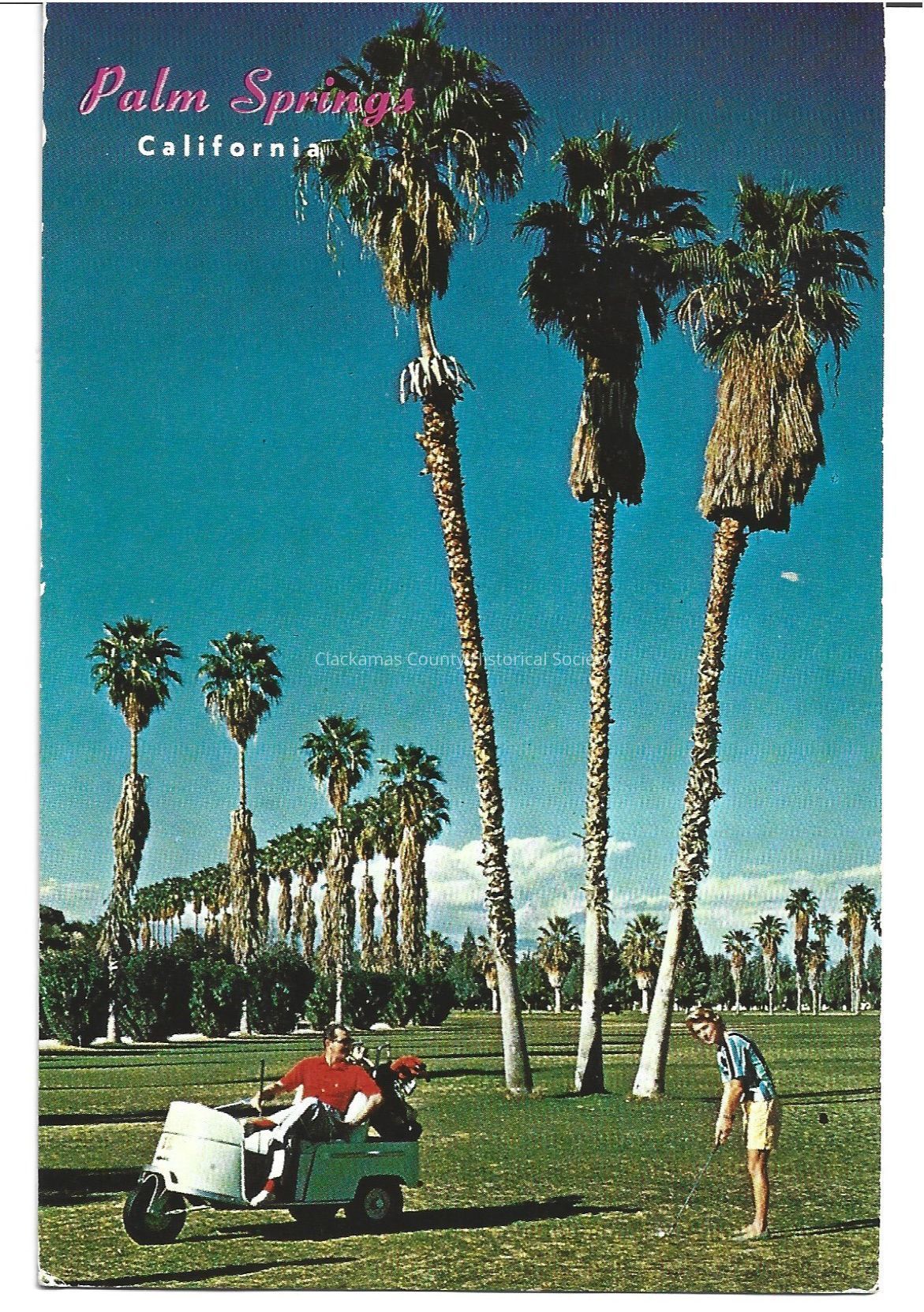 This item is a postcard from Norman Hunter from Palm Springs California. Picture on front is of palm trees and a golf course with golf cart and golfers.