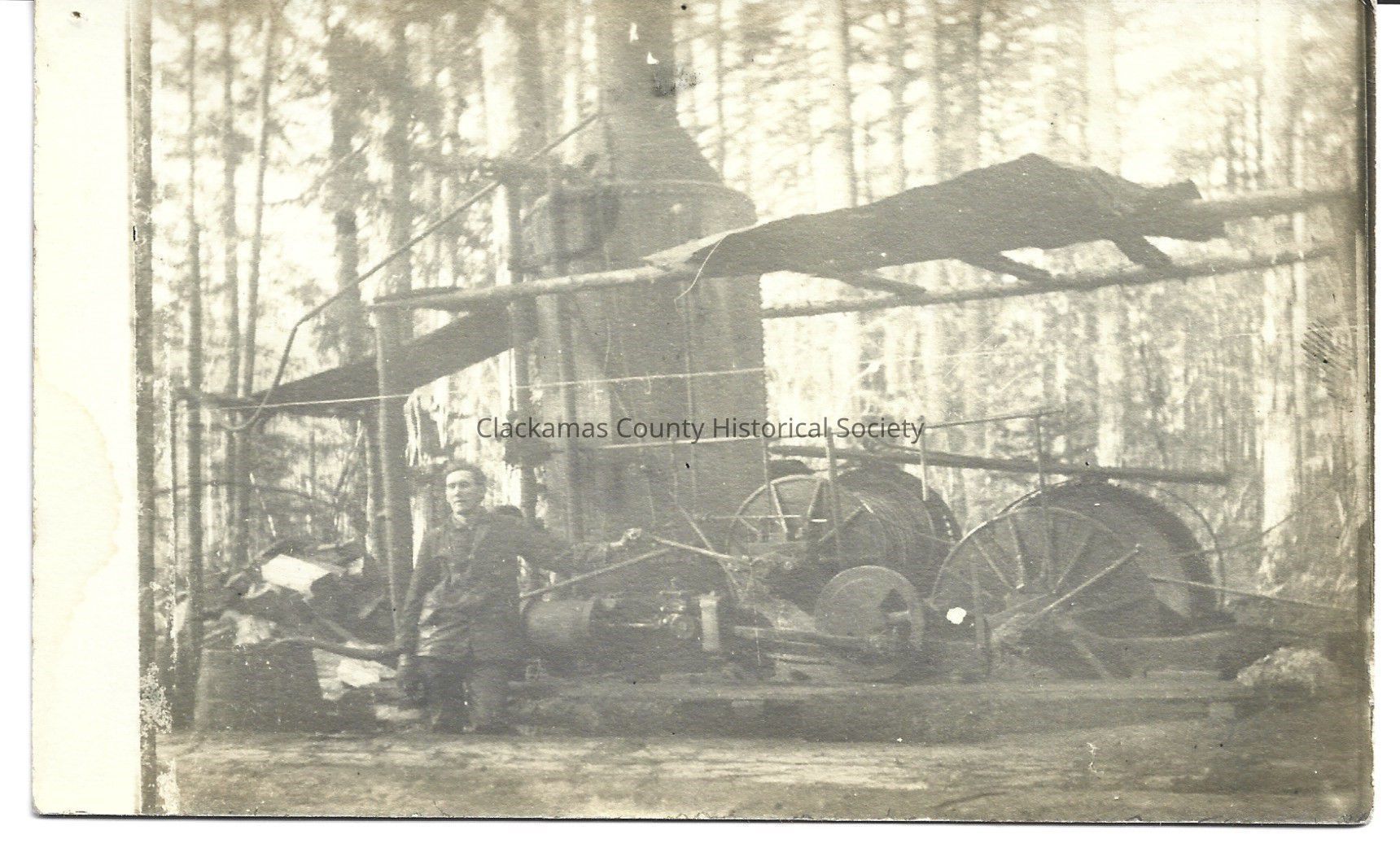 Photograph postcard. Man in front. In a forest with equipment/engine related to the lumber industry.