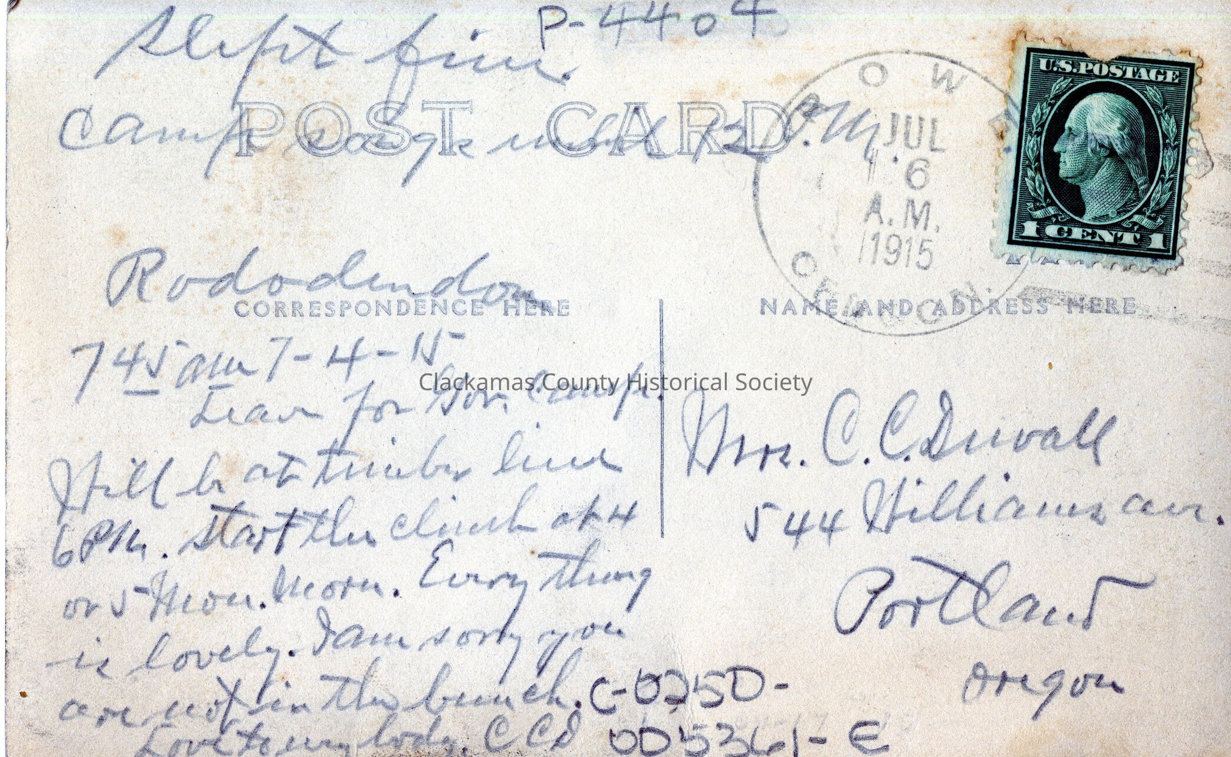 Postmarked July 6, 1915 to Mrs. C.C. Duvall, Portland