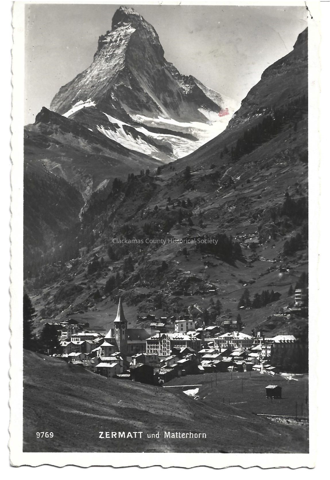 Photograph of Zermatt and Matterhorn on front. Ruffled edges of document.