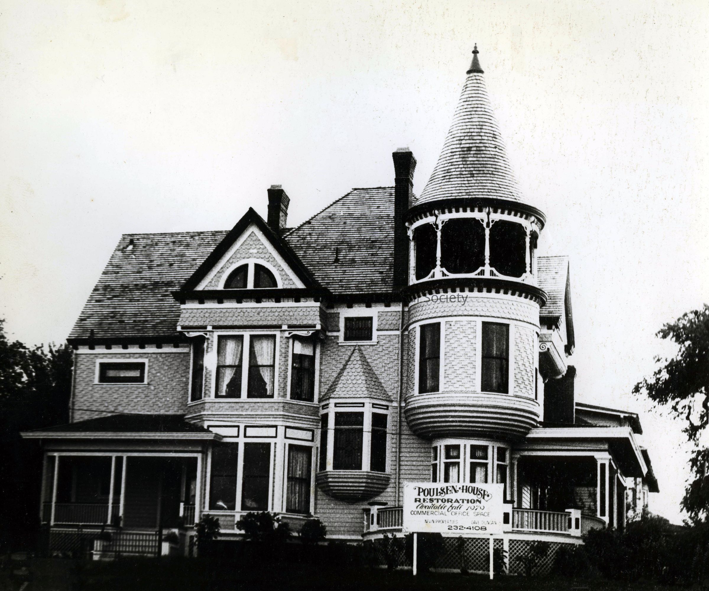 Poulsen House, Portland, Oregon, 1981. Back of photo refers to Inman Poulsen Mill. House is located at the east end of the Ross Island Bridge. Photo shows it was being restored in 1979. Poulson's partner Inman had a similar house built across Powell on the same side of the river. It stood where the exit is from 99E (JAH 10/2022)Made/Created