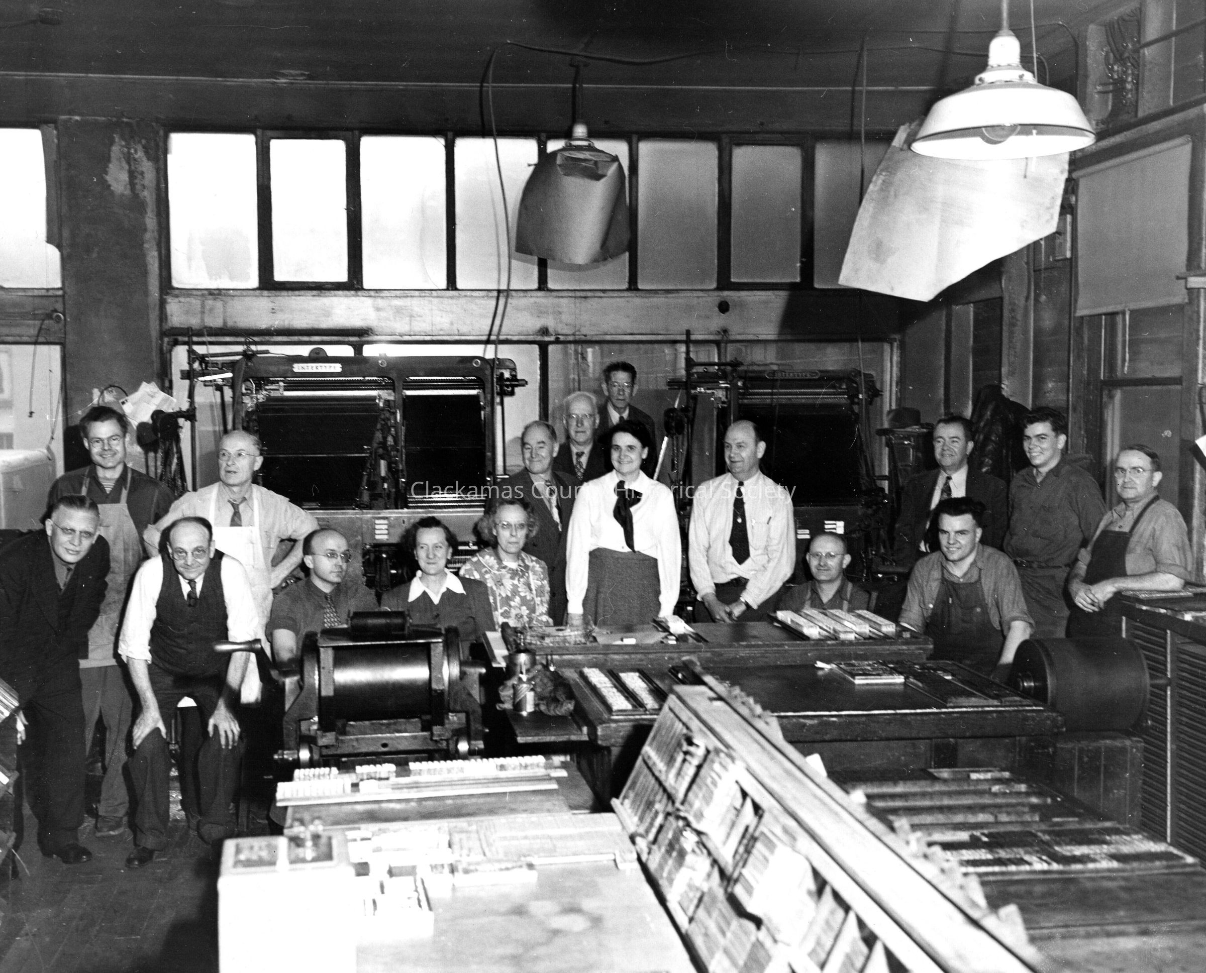Oregon City Press Room. Note old style linotype machines in background.