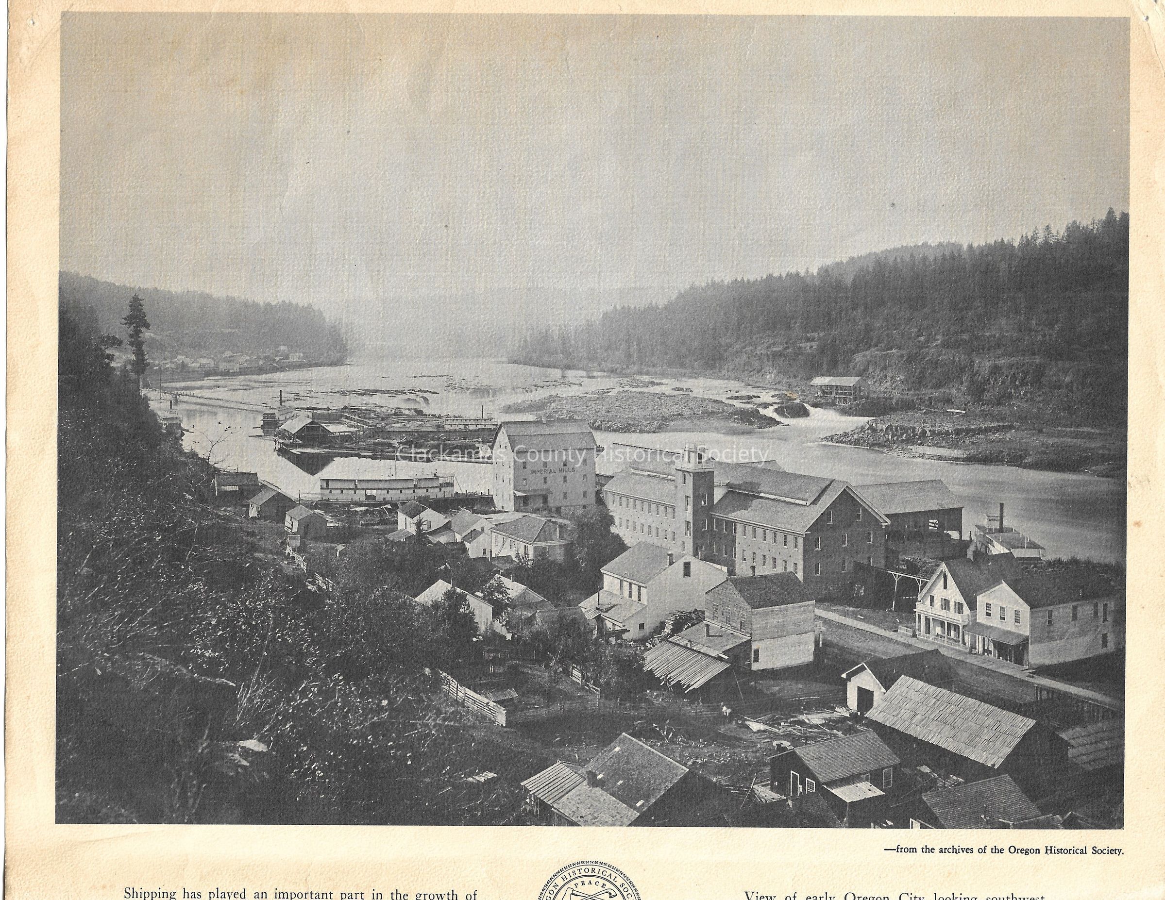 Photo "View of early Oregon City looking southwest to the falls of the Willamette. The Steamer in the boat basin is the "Canemah"" Circa
