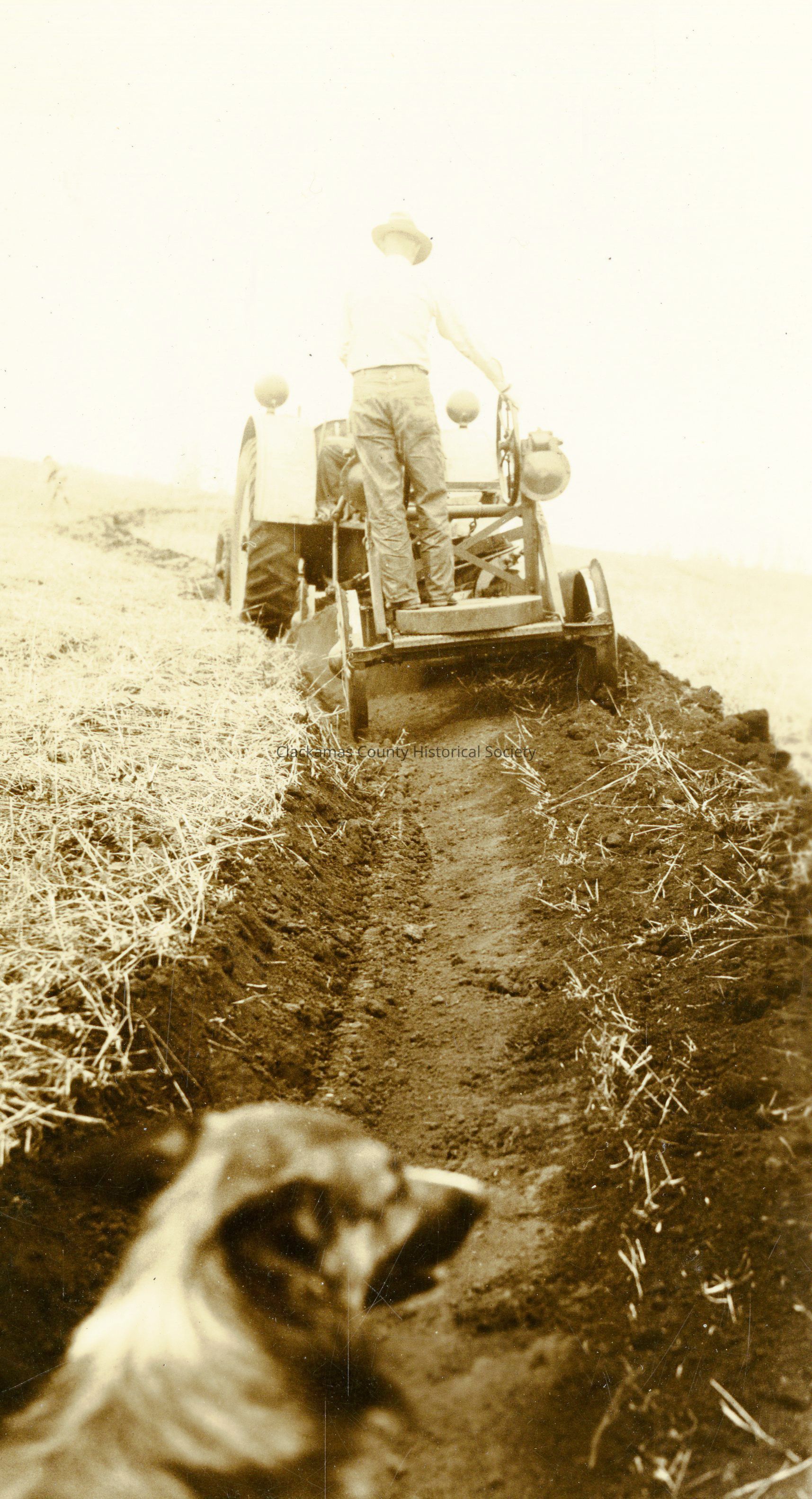 Redland 1938 - Polehn Farm - Man on Tractor Terracing for Erosion in Redland Area during summer of 1938. A dog is following tractor.