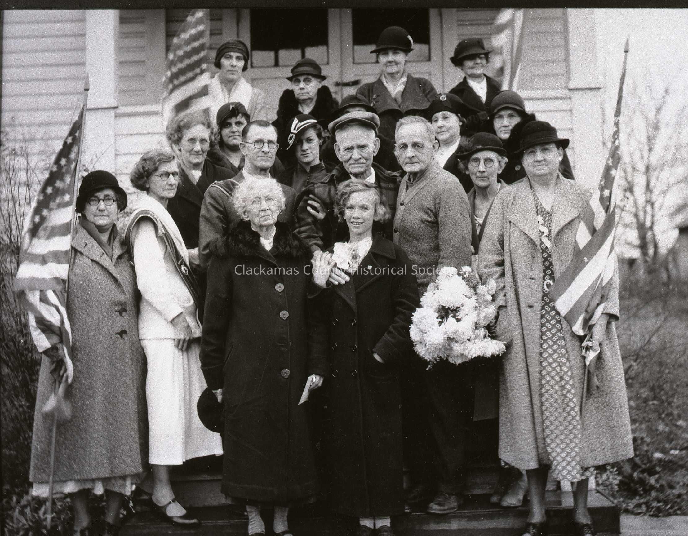 Group photo taken on Grange Hall steps, 24 Nov 1934; 10 members of Daughters of Veterans: Mr. and Mrs. David McArthur, Mr and Mrs E.M. Haines, Mrs. Isabell Newman, Mrs. Alice Pitts, Miss Barbara Jean Pitts, Miss Isabell (Meeks) Mr. Maurice Meyers.Made/Created