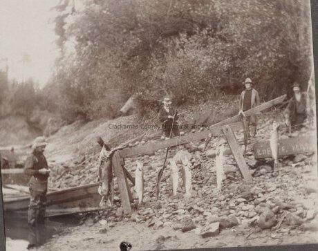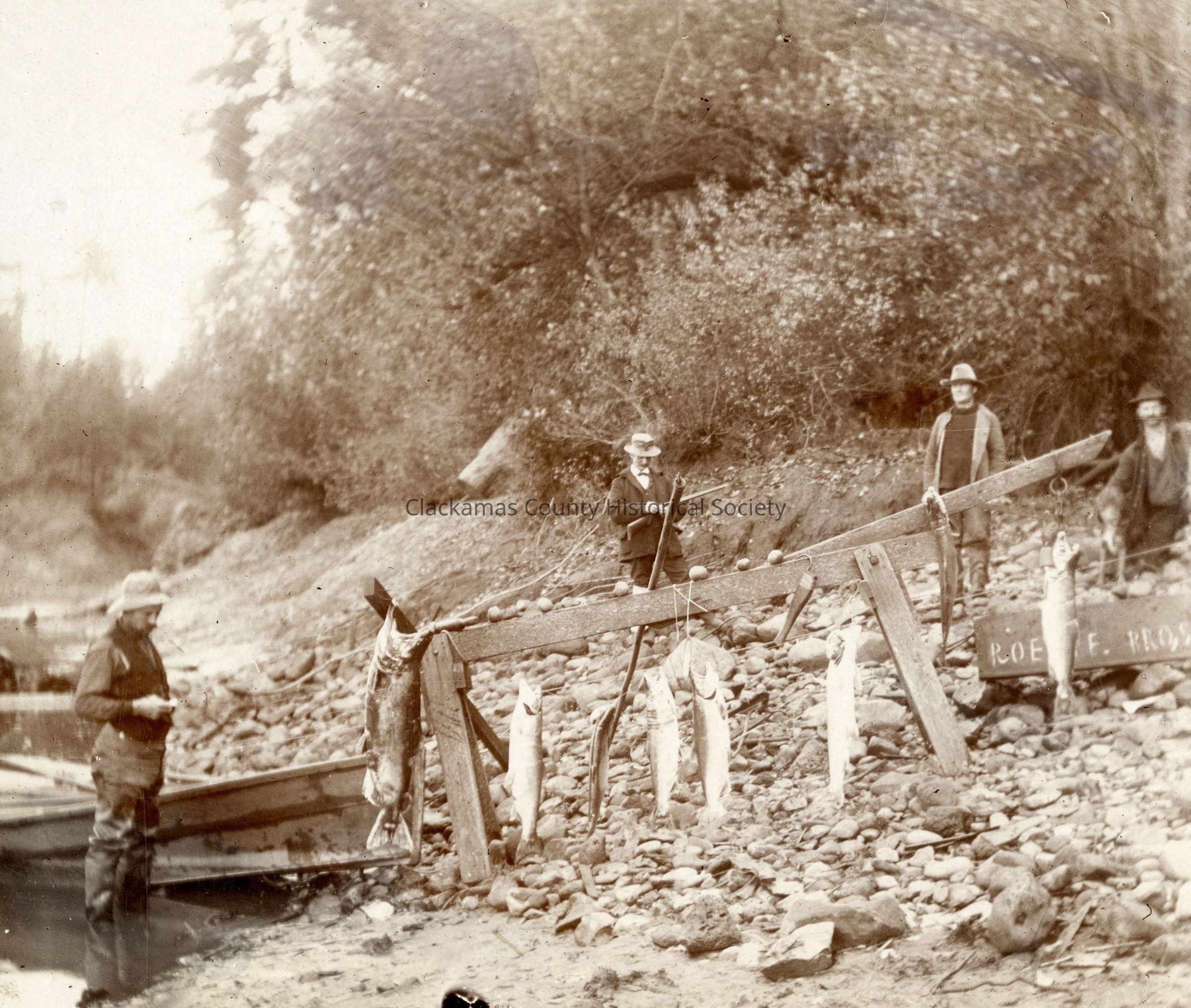 Roethe Landing on Willamette River 1905. Ed Roethe, Phil Oatfield, Paul Roethe, Cliff Mattoon with fish. see also P-1025.002433