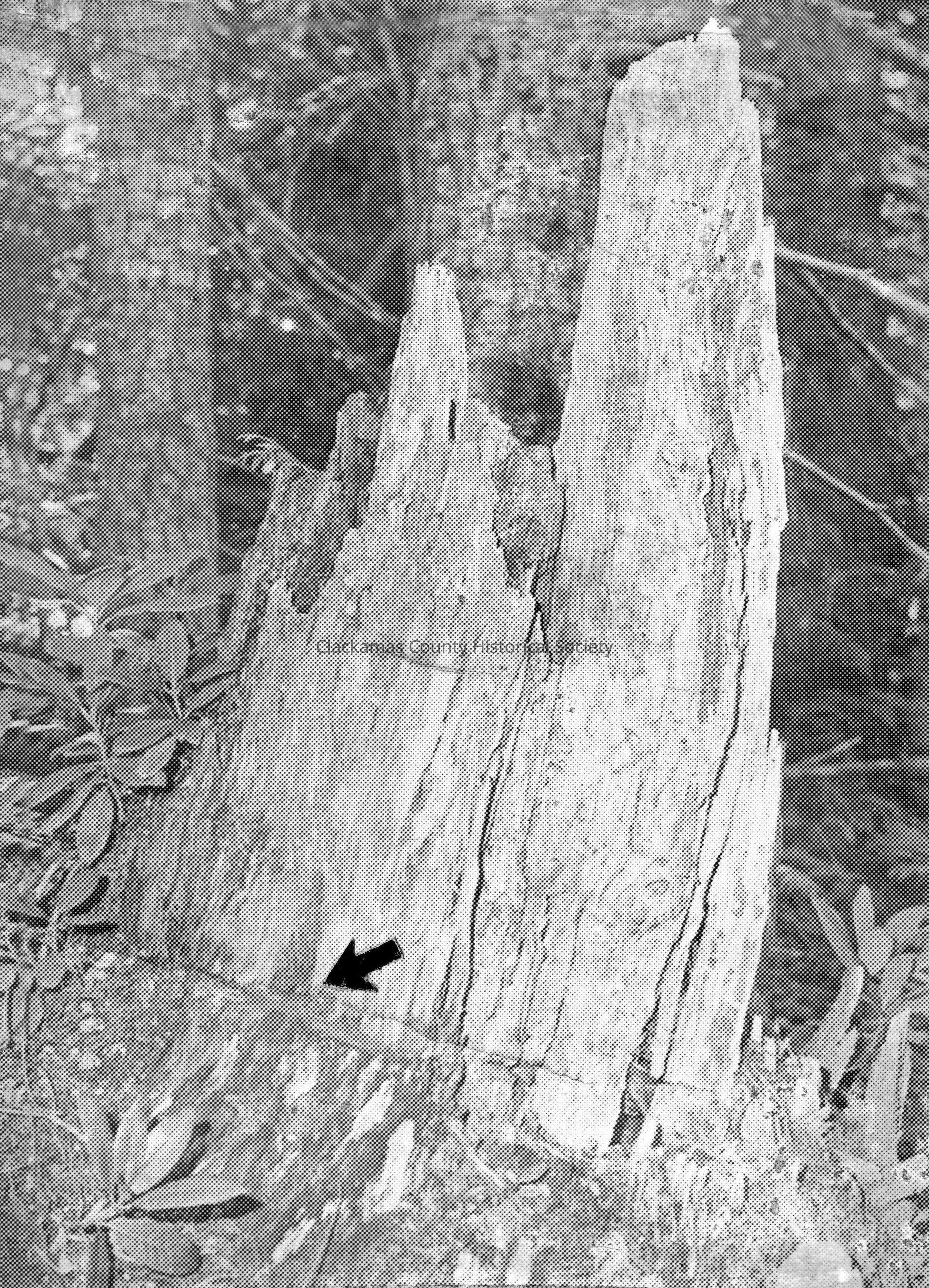 Mt. Hood, Laurel Hill. Photo shows rope burn tree stump (wagons being moved). This can be seen from highway.Made/Created