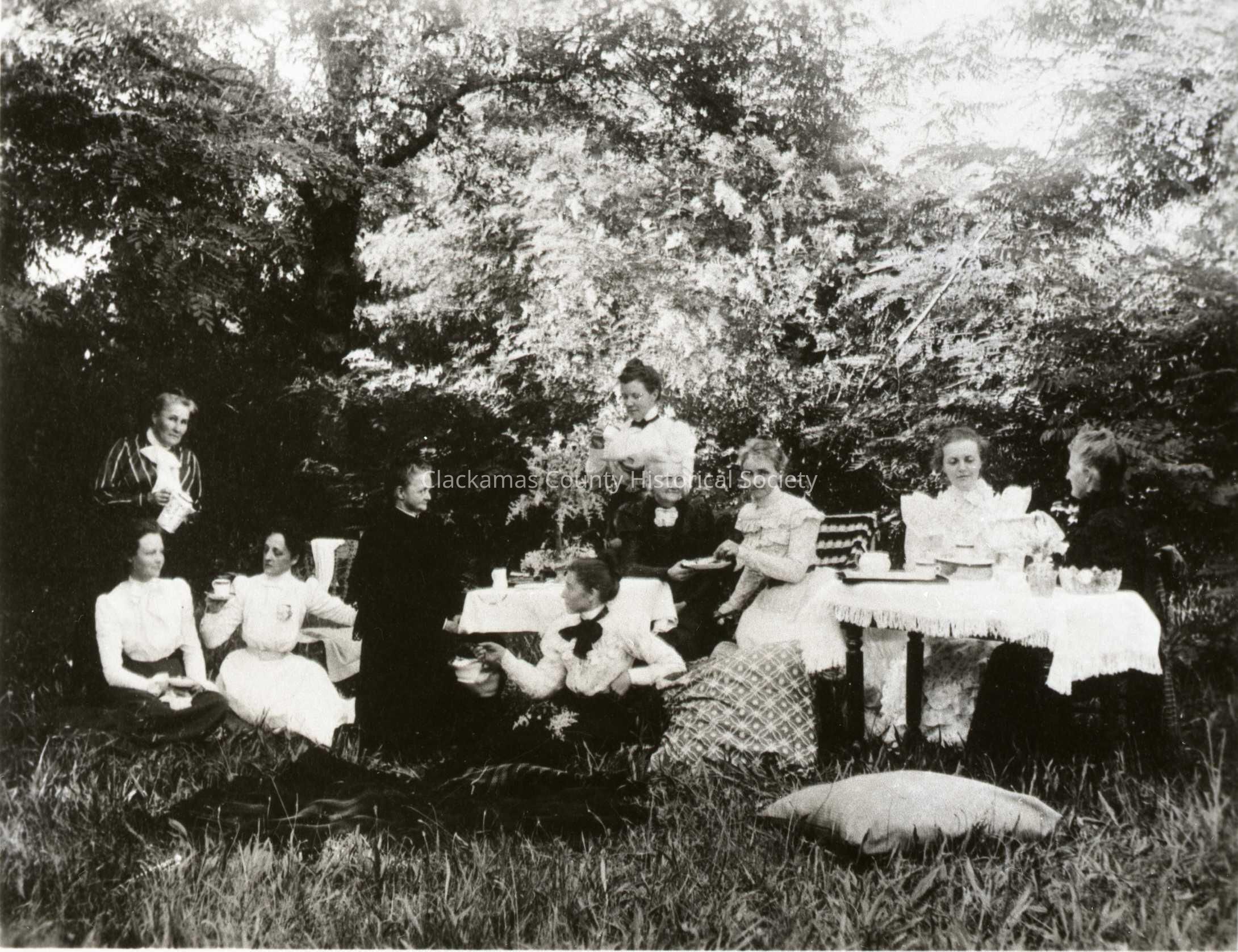 Sitting (L-R): 1) Mrs. Ward Lawton; 2) Miss Ella Williams; 3) Mrs. Ed Kellogg; 4) Mrs. Ed Titus; 5) Mrs. Williams; 6) Mrs. Stafford; 7) Miss Helen Riggs; 8) Miss Helen Riggs; and 9) Mrs. Dan O'Neill.Made/Created
