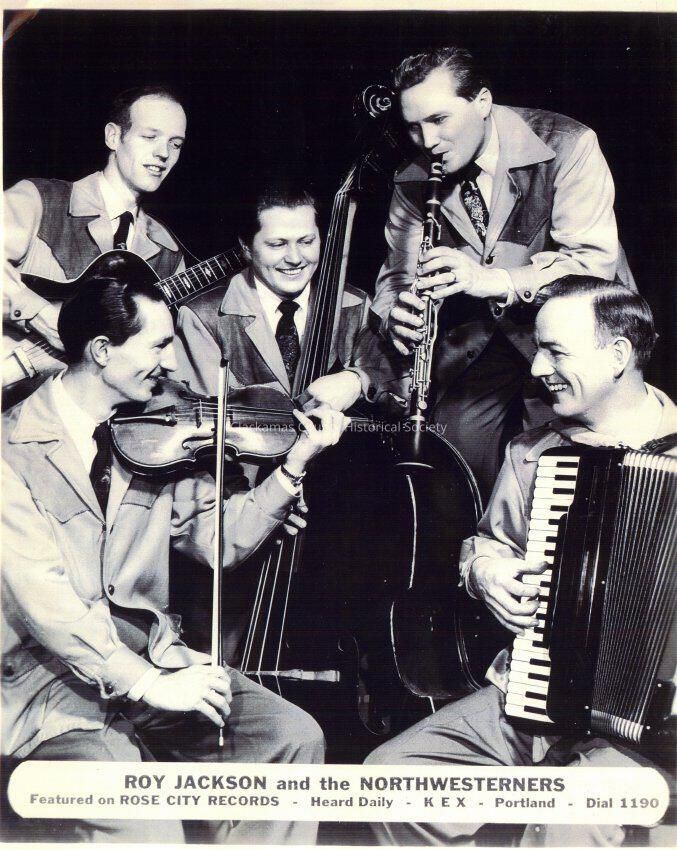 Late 1940s photo of Roy Jackson and Northwesterners KEX. Cash Duncan on violin, Slim McKethen on guitar, Dan Yeary on string bass, Roy Jackson on clarinet, and Marcellus Martin on accordian.Other Names and Numbers