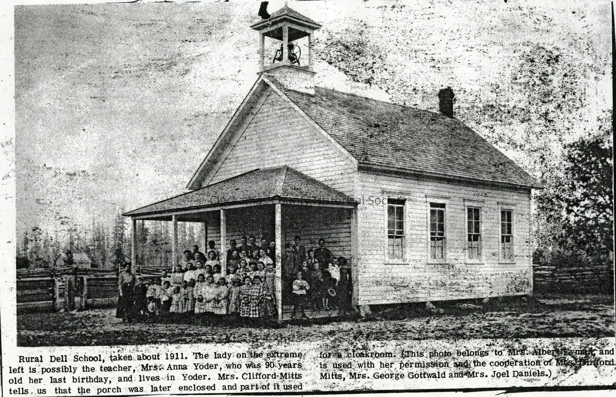 Rural Dell School in a photocopy of newspaper picture taken about 1911. The teacher was Mrs. Anna Yoder. The porch was later enclosed for a cloakroom for the school. There is no date of publication nor paper it was published in.