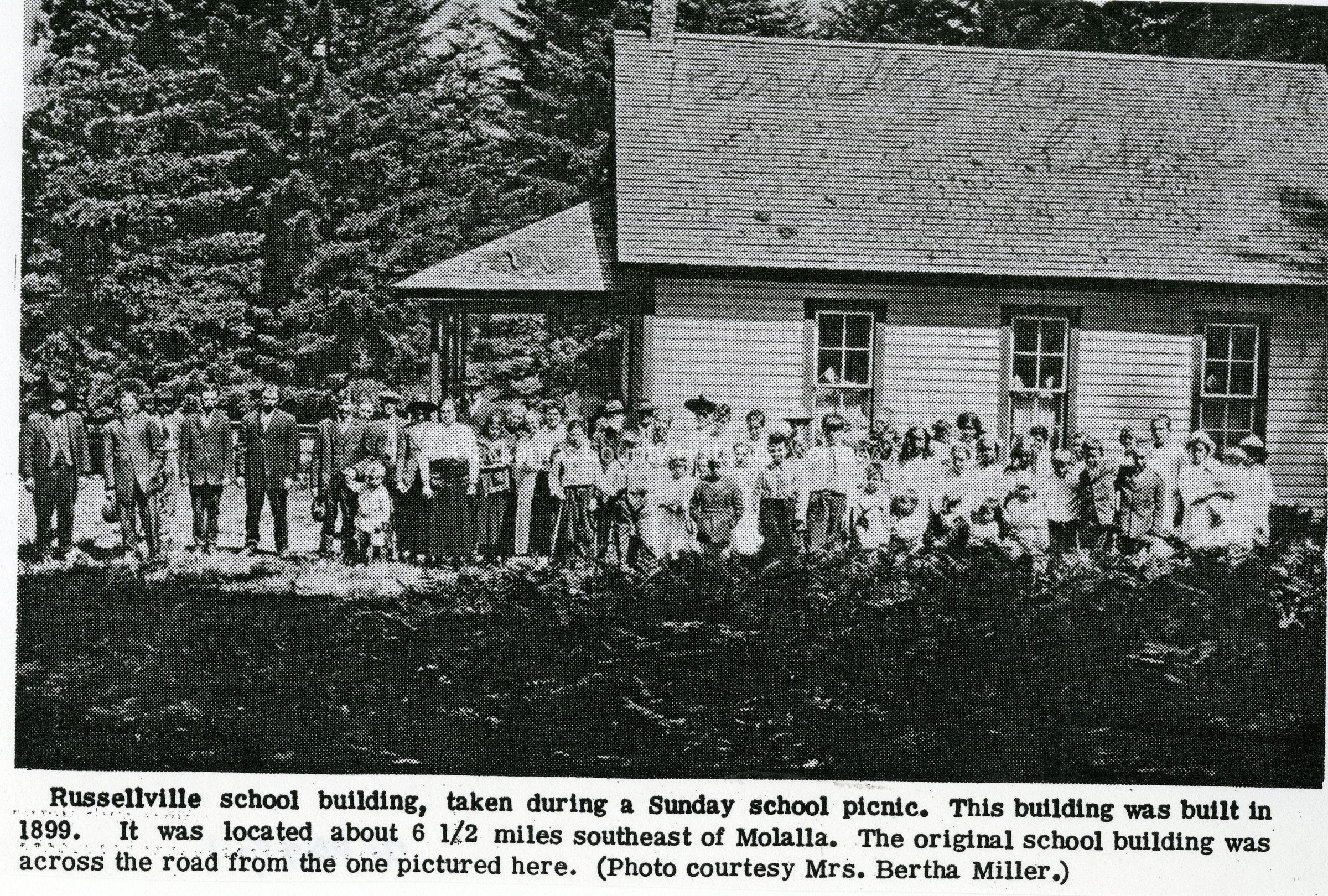 Copy of photograph from newspaper of the Russellville School Building built in 1899, taken during a Sunday School picnic. Located 5-1/2 miles southeast of Molalla, Oregon. The original building was across the road from this building according to the caption under the picture courtesy of Bertha Miller. Date of picture is unknown.Other Names and Numbers