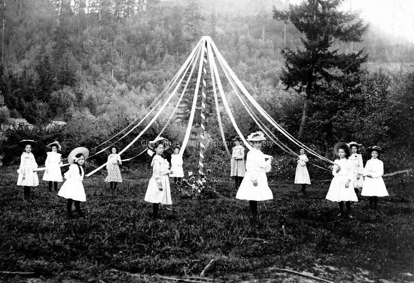 Ruth Anderson with group doing May Pole Dance. Ruth is near the left with curls around the hat.Made/Created