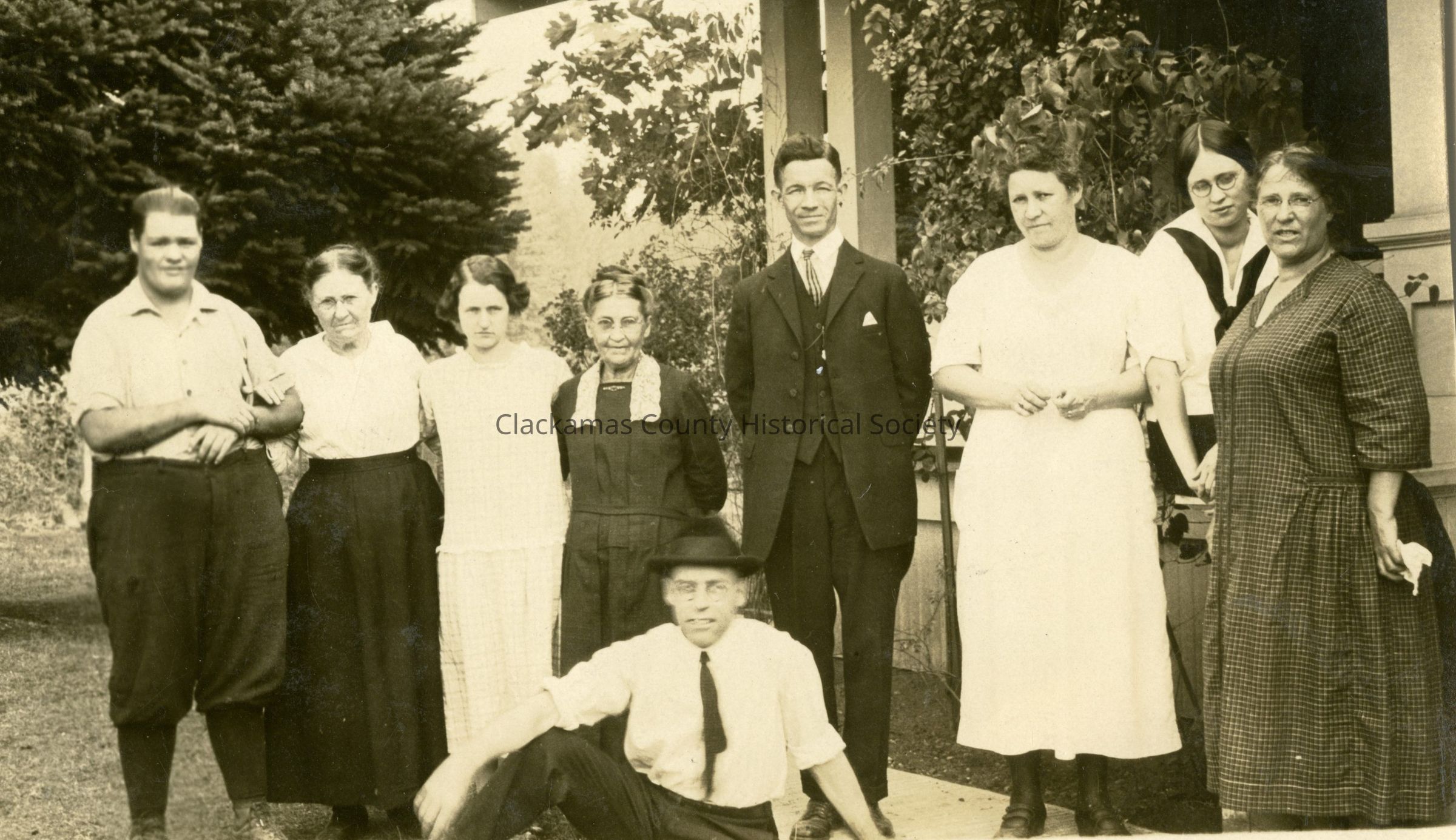 Left to right: Jack Ryckman, Emma (Talbert) Davis, Thelma Ryckman, Anna (Talbert) Palmateer, unidentified man, Jessie Talbert, unidentified girl, Mollie (Talbert) Ryckman. Matt Ryckman sitting on ground.Inscription/Signature/Marks