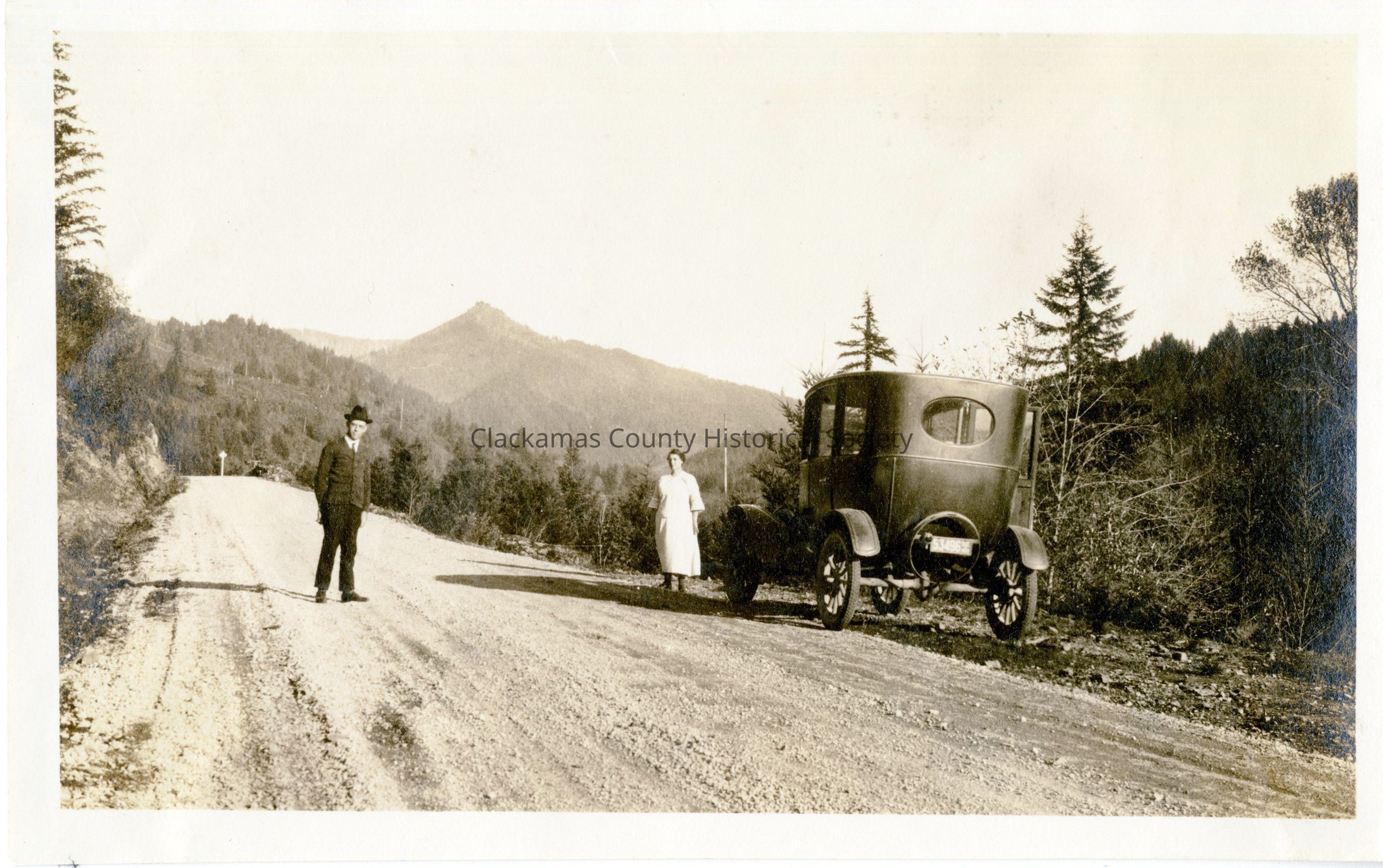 Matt and Jessie Ryckman with their car on a road in a forested area