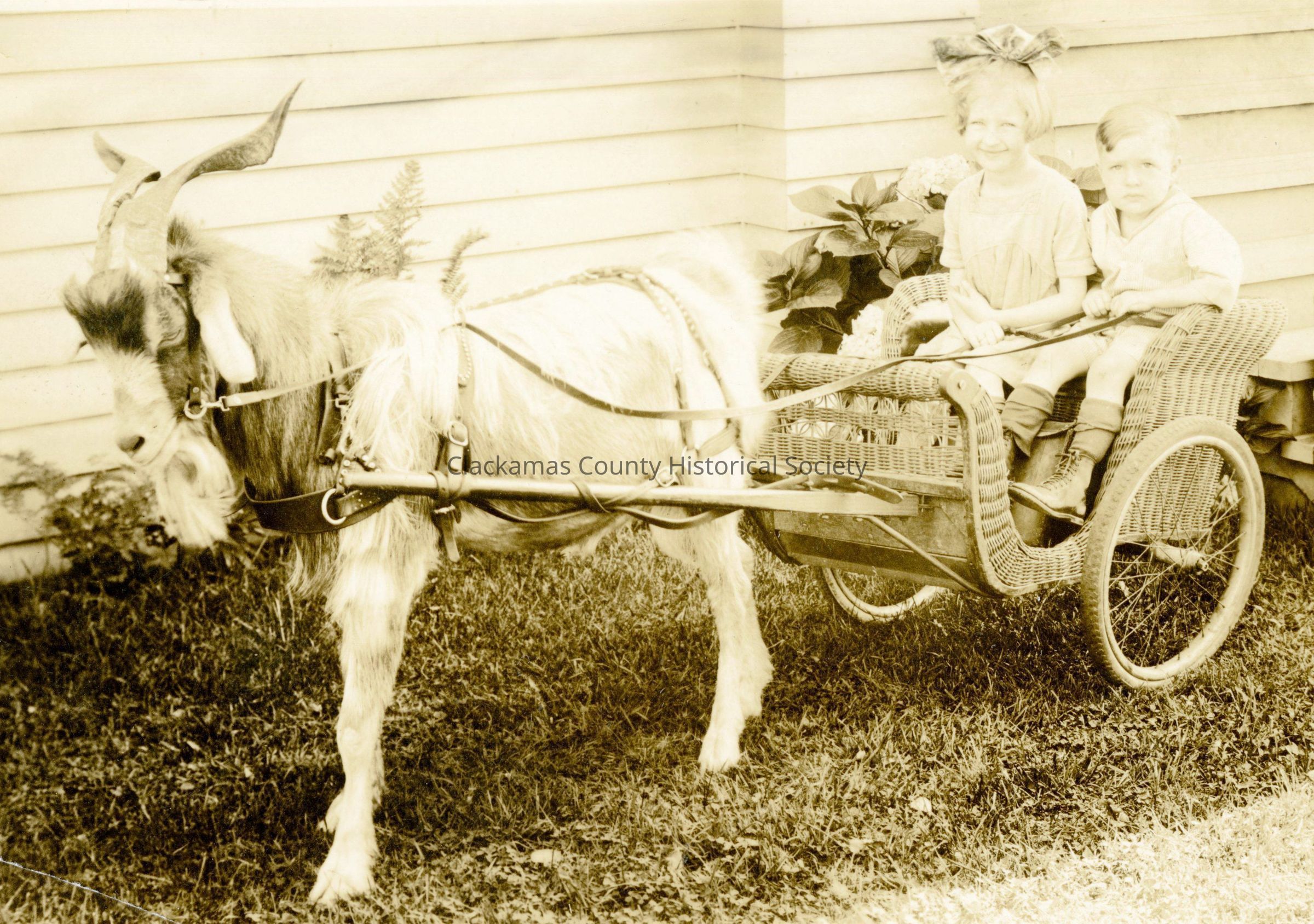 Possibly Thelma and Jack Ryckman in cart pulled by a goat