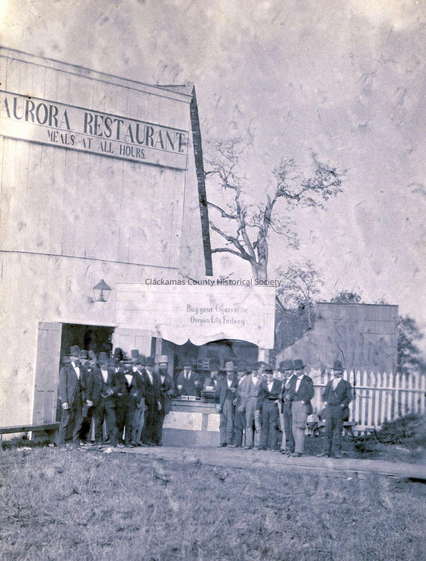 Aurora Colony Restaurant at the State Fair in Salem. The sign reads, "Buy your cigars of the Oregon City Factory."Made/Created