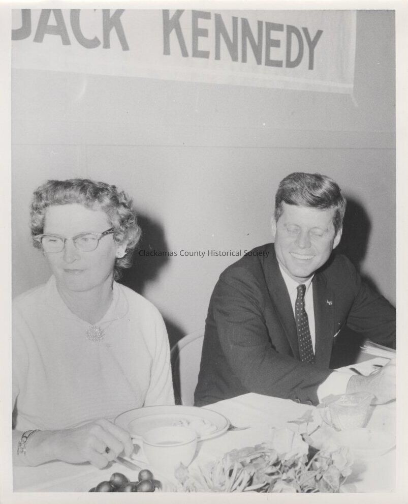 Senator Jack Kennedy at banquet in Clackamas County with a woman sitting his right side. Senator Kennedy has his eyes closed and is smiling. The woman has her hand on a teacup and is looking of to her right. (Photo #70)Made/Created