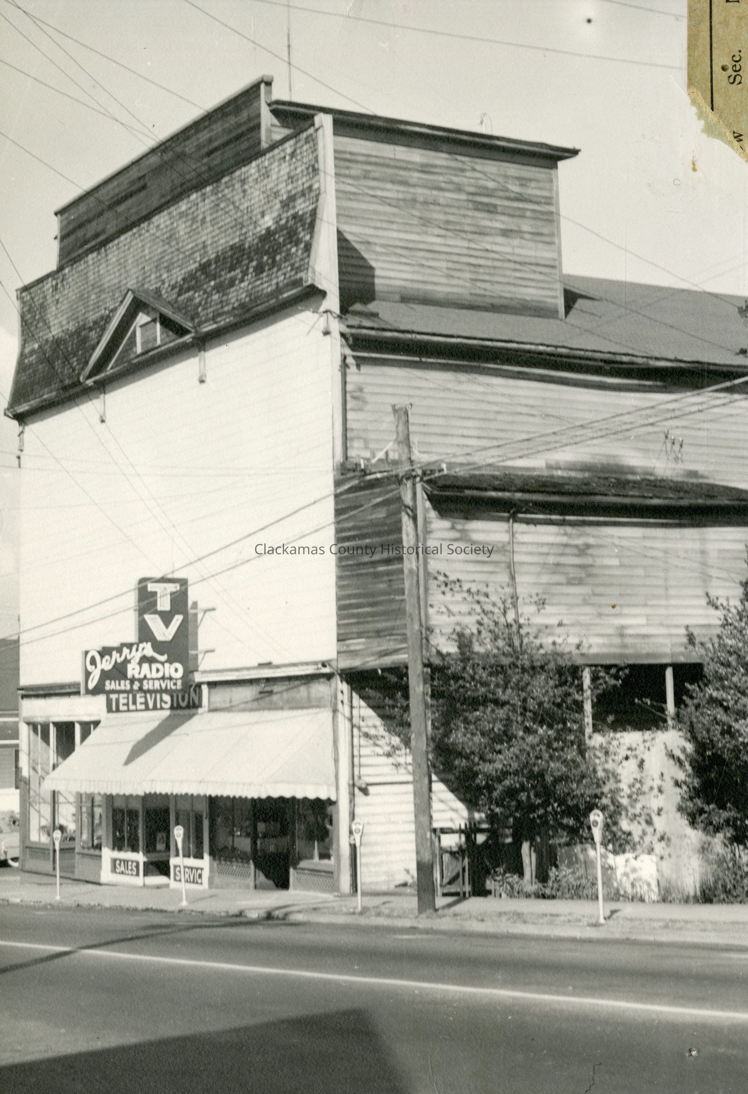 Shively Theater or Opera House at 7th & Madison, Oregon City. Photo shows Jerry's TV and Radio Store. Built in 1885