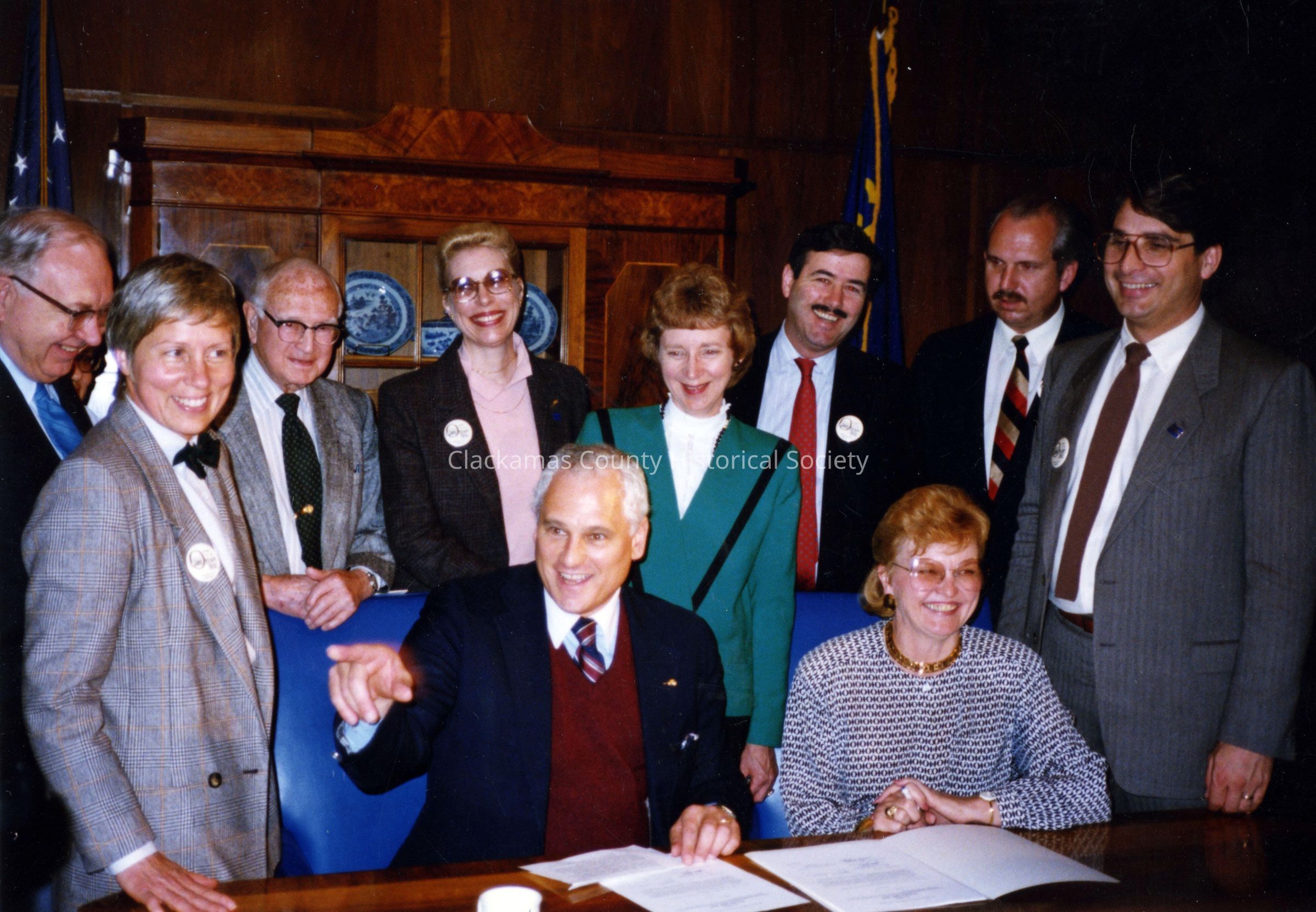 Front Row (L-R): 1) Governor Neil Goldschmidt; and 2) Secretary of State Barbara Roberts.Made/Created