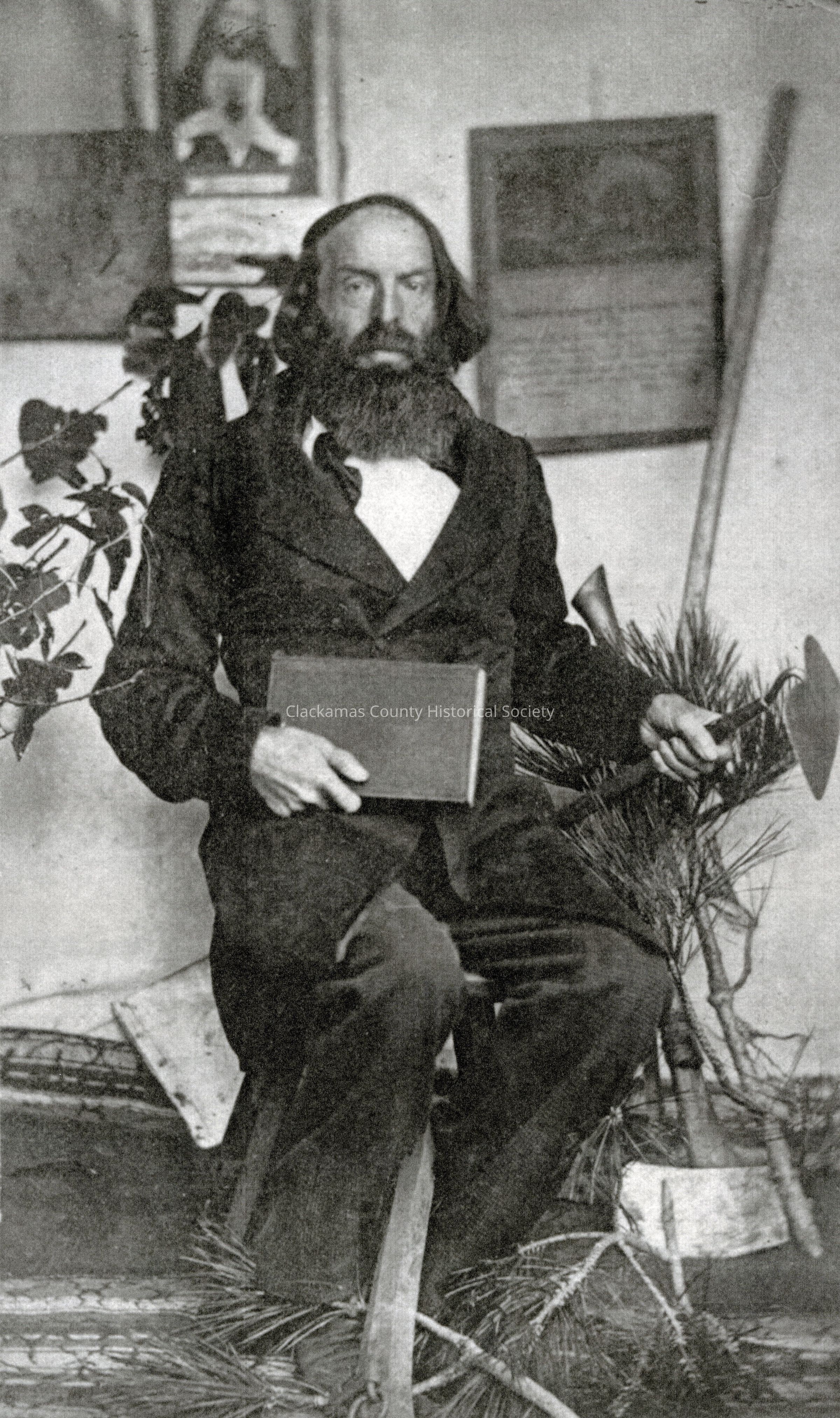 Photocopy of picture. Rev. Henry Spalding seated holding a hoe and book. Early Oregon Country Missionary. See Web Links 98.45.01 3E; P-48