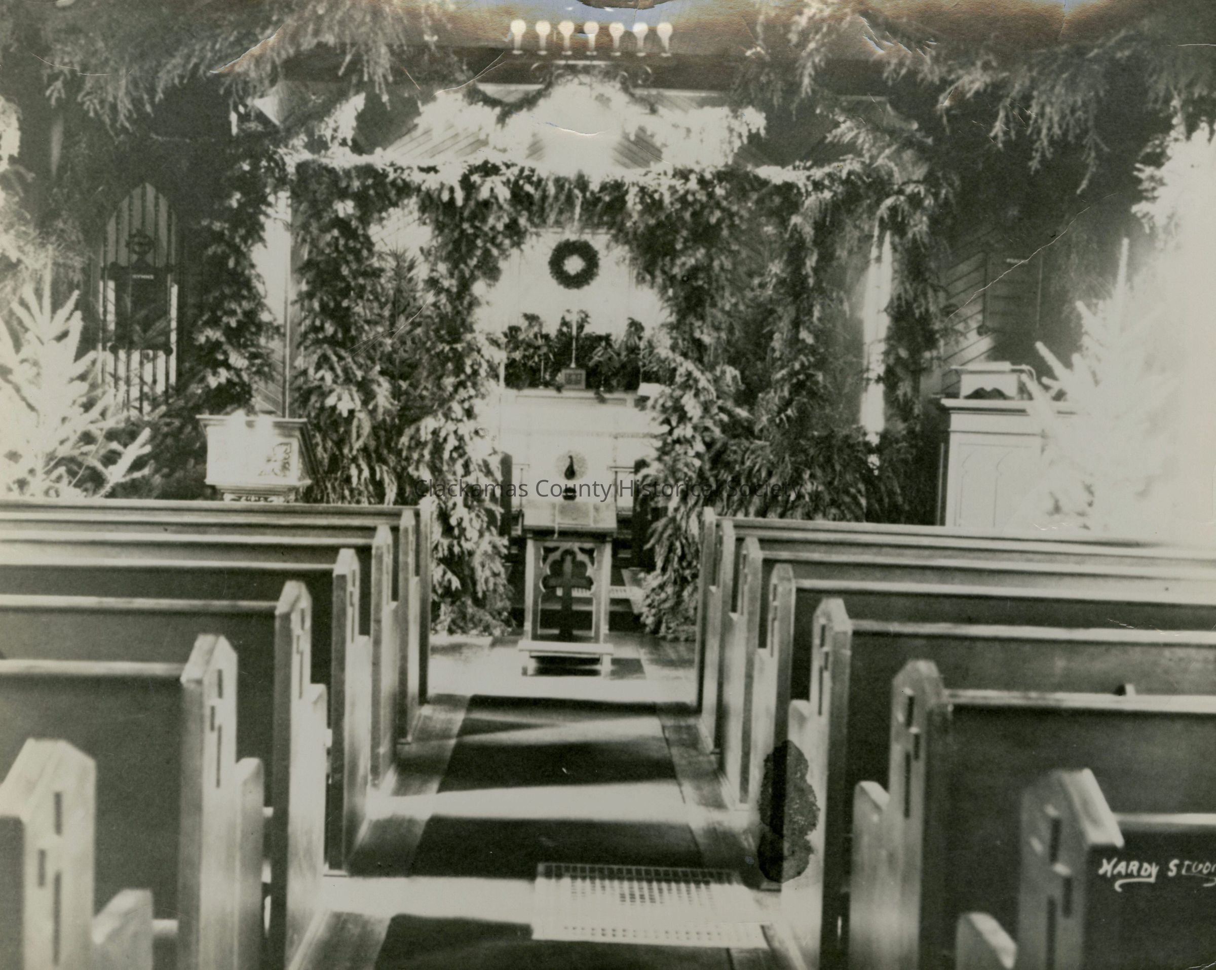 Interior of St. Paul's Episcopal Church, first building. Decorated for Christmas - 2 Copies