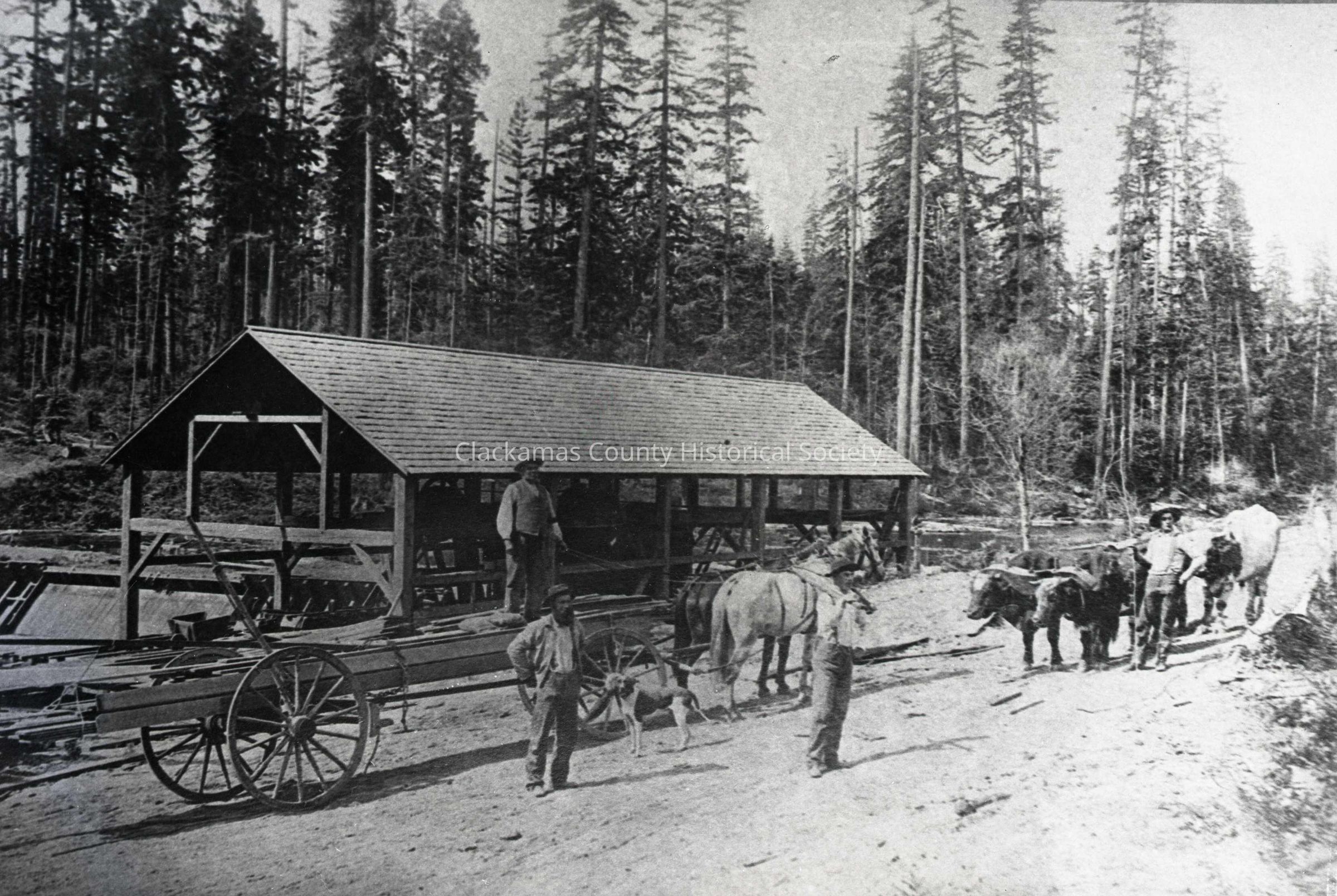 Saw Mill on Tualatin River. John Kruse on wagon; Hugh Githens with dog; George Saum, Jr., with board; and George Saum, Sr., with Oxen.Made/Created