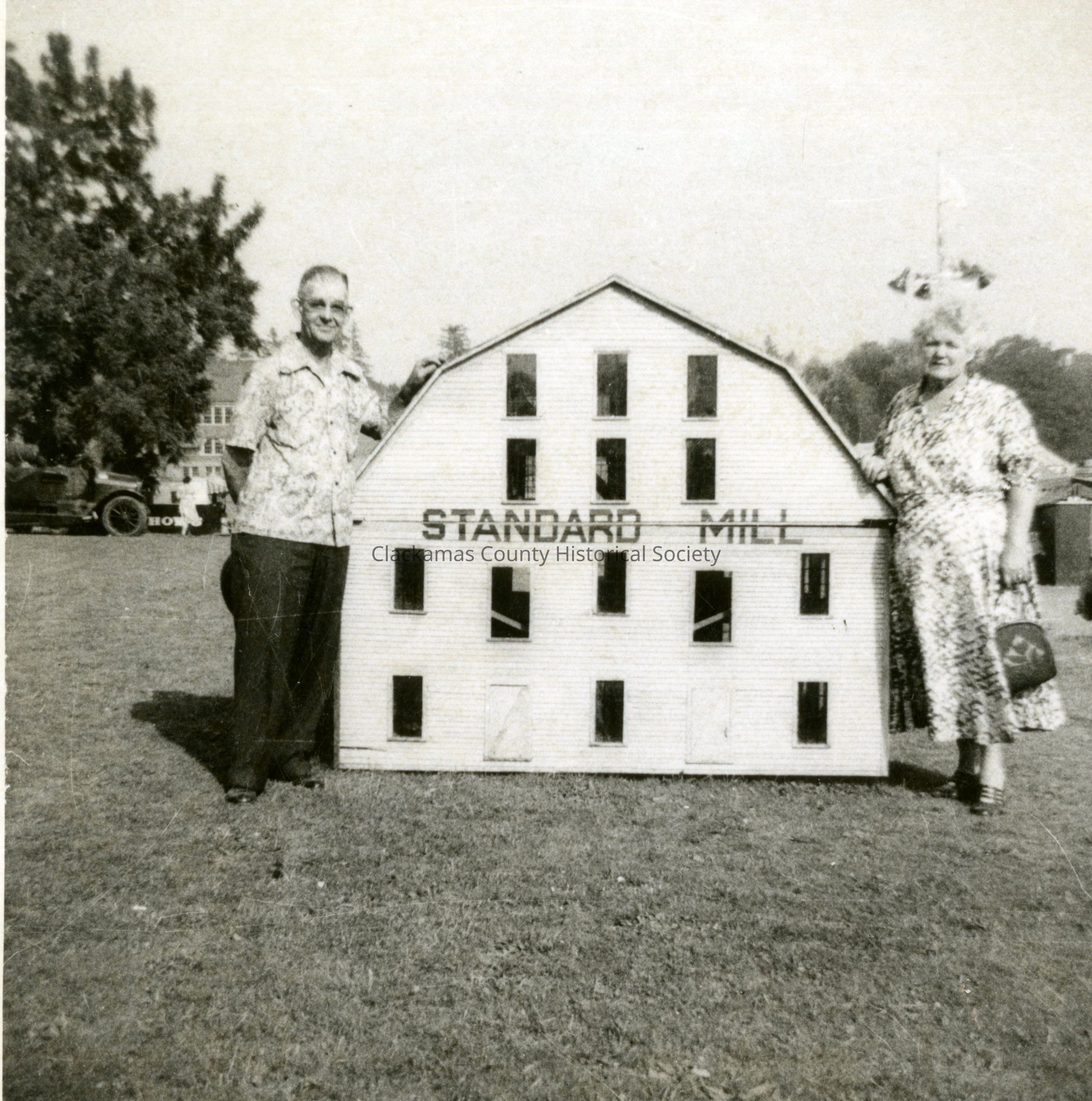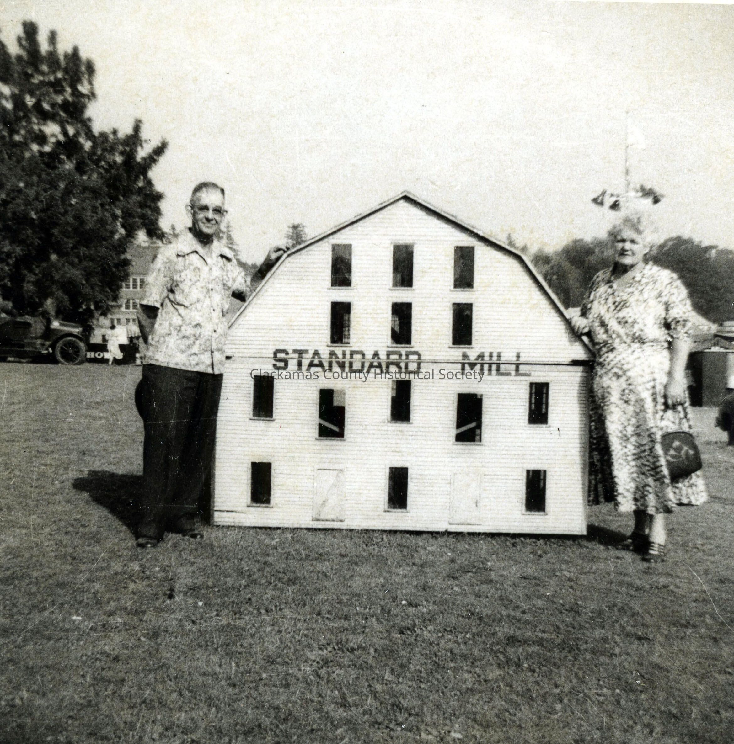 Scale model of Standard Mill used in Milwaukie Centennial Celebration. Jim and Rose Grizzell in photo. 1947. Jim, Jr. helped to build it.