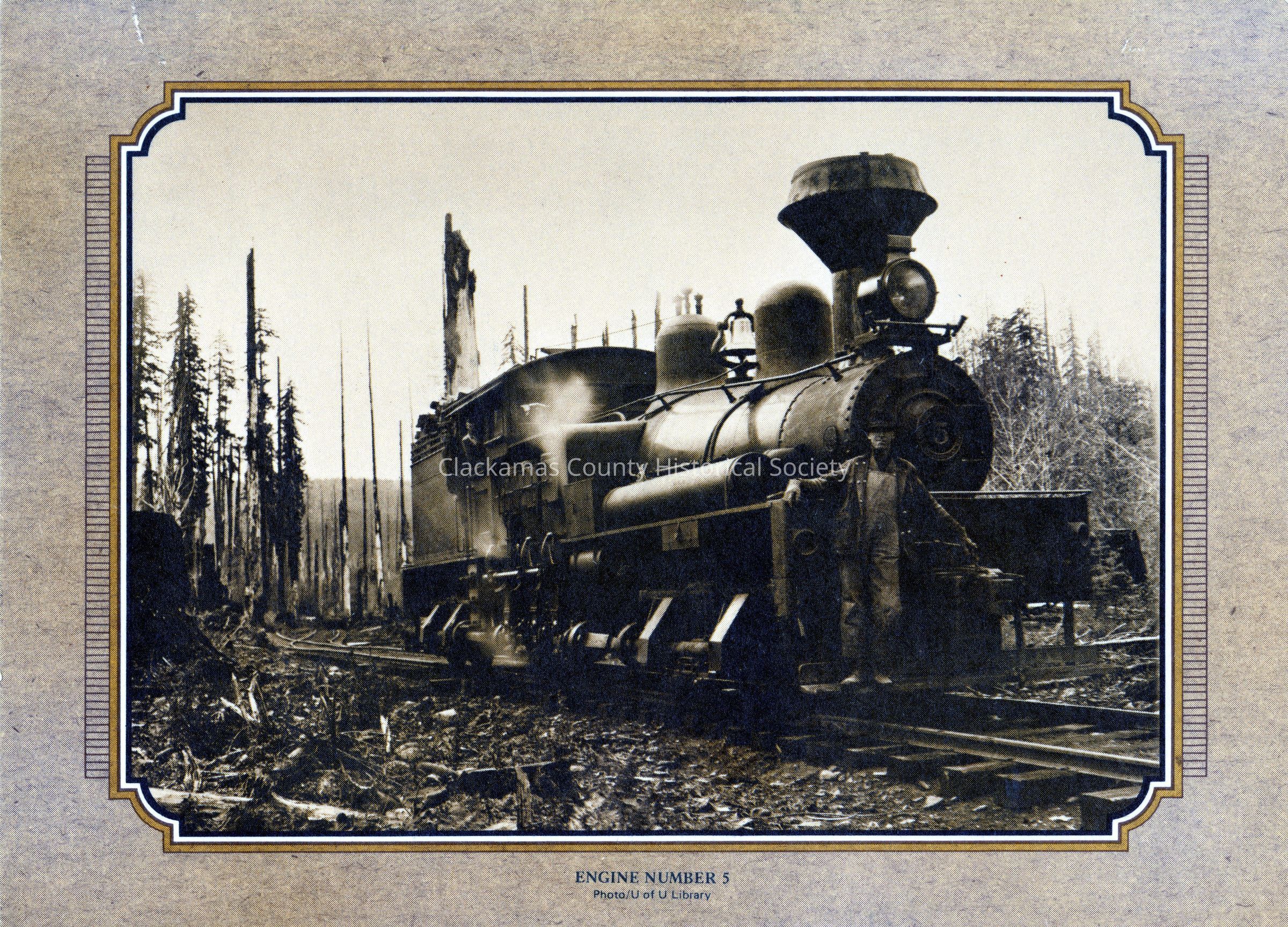 Postcard of #5 Steam Locomotive Engine. Burned forest in background.