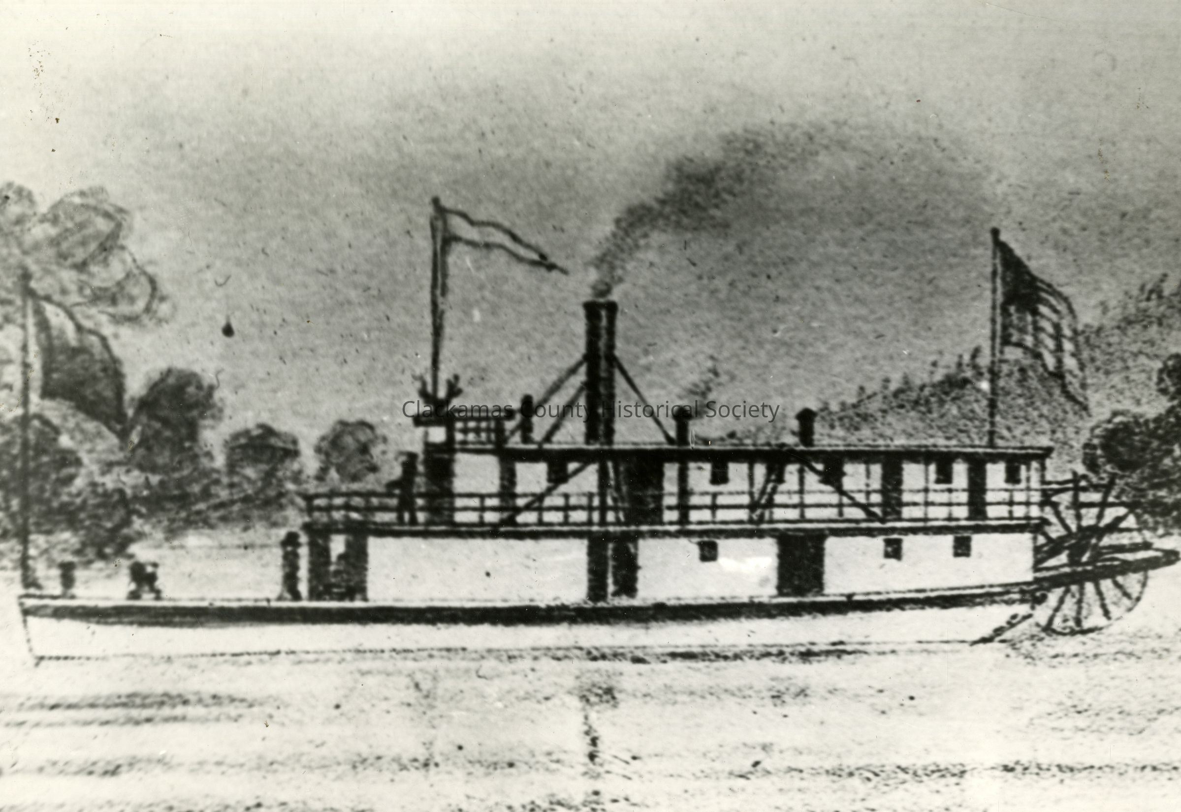 "Elk, Willamette River Steamer, built at canemah and launched in Oct. 1857, destroyed by boiler explosion in 1860's at Davidson Landing on Willamette River Photo donated by W. Howell