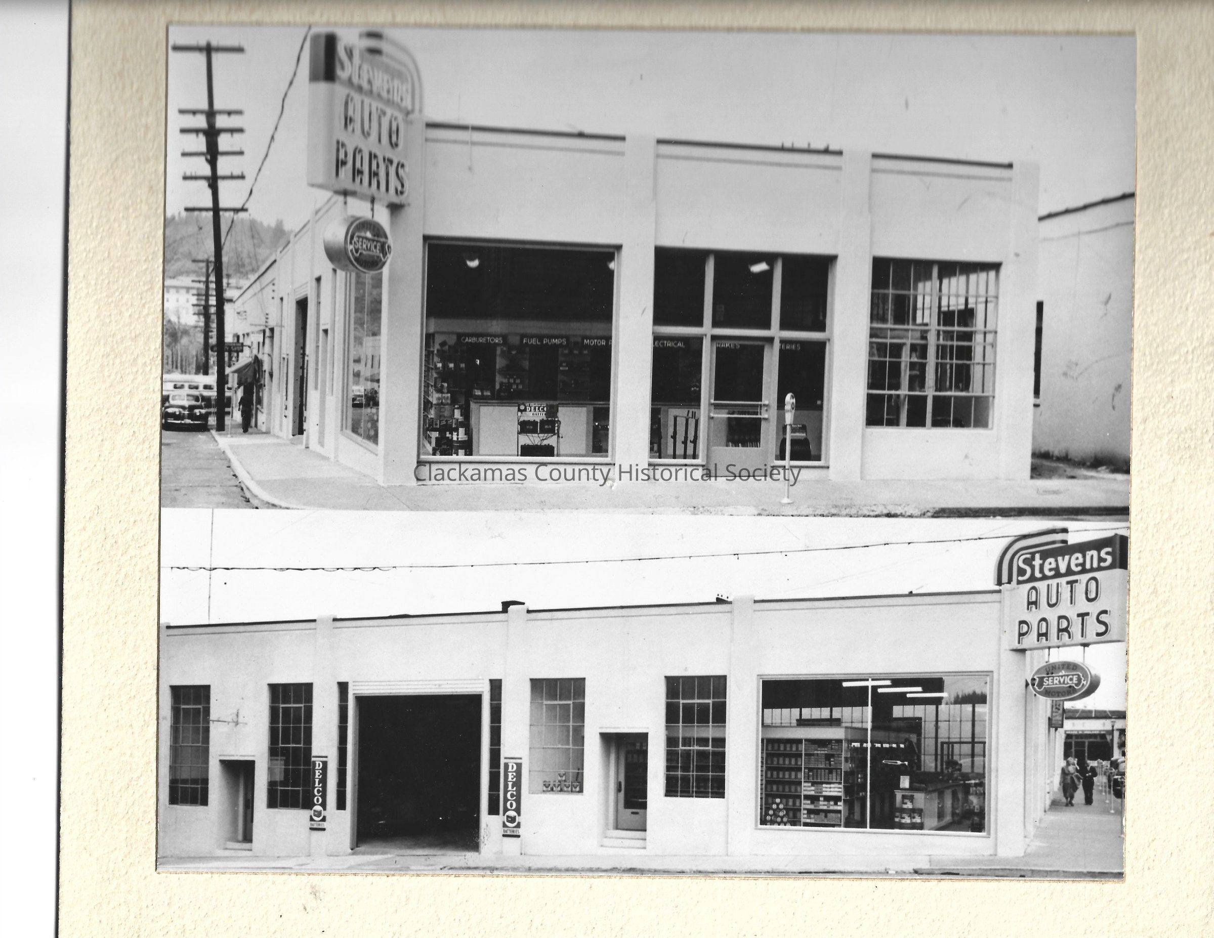 Photograph is two views of Stevens Auto Parts, store on 6th and Railroad Ave in Oregon City. Owned by Harley Stevens Jr. Mounted on cardboard. No date (automobile in distance in photograph appears to be a model from the 1940s).