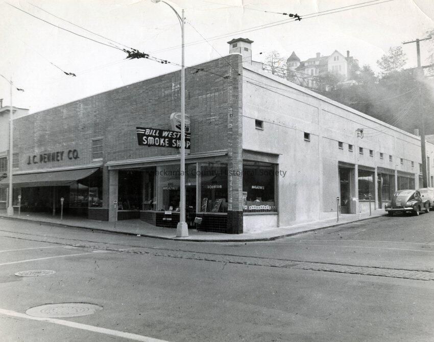 Stevens Building, 612 Main Street, Oregon City. Photo states that it was taken after restoration from the fire in July 1950. Photo shows J.C. Penny Co. store and Bill West's Smoke Shop.Made/Created