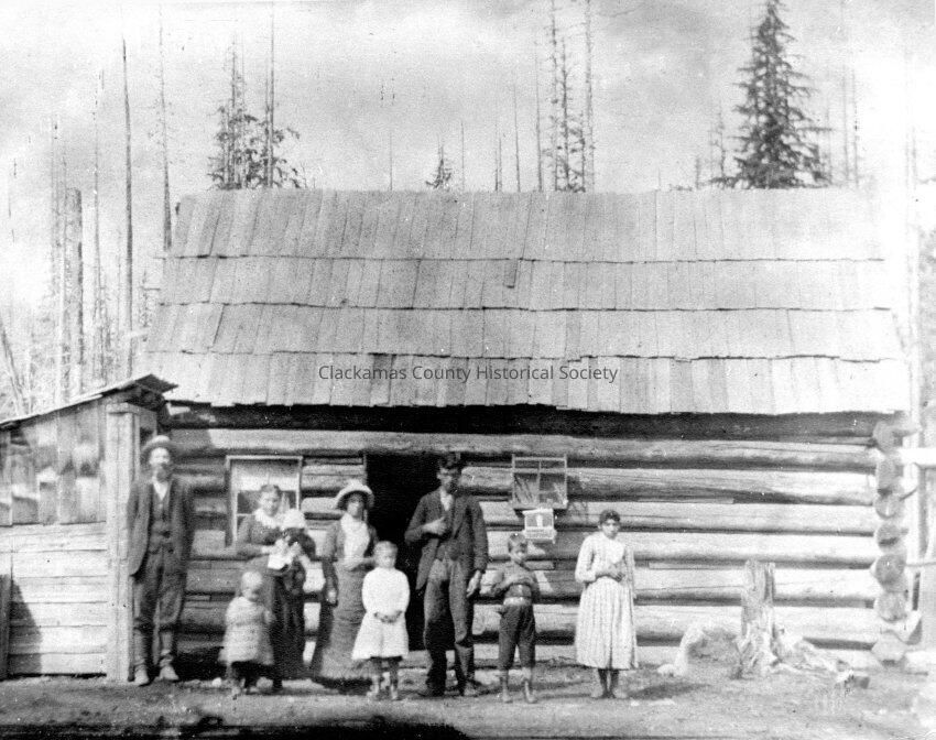 Summit House (original), Mt. Hood, Siever's Family, ca. 1888. Log cabin. 9 family members.Made/Created