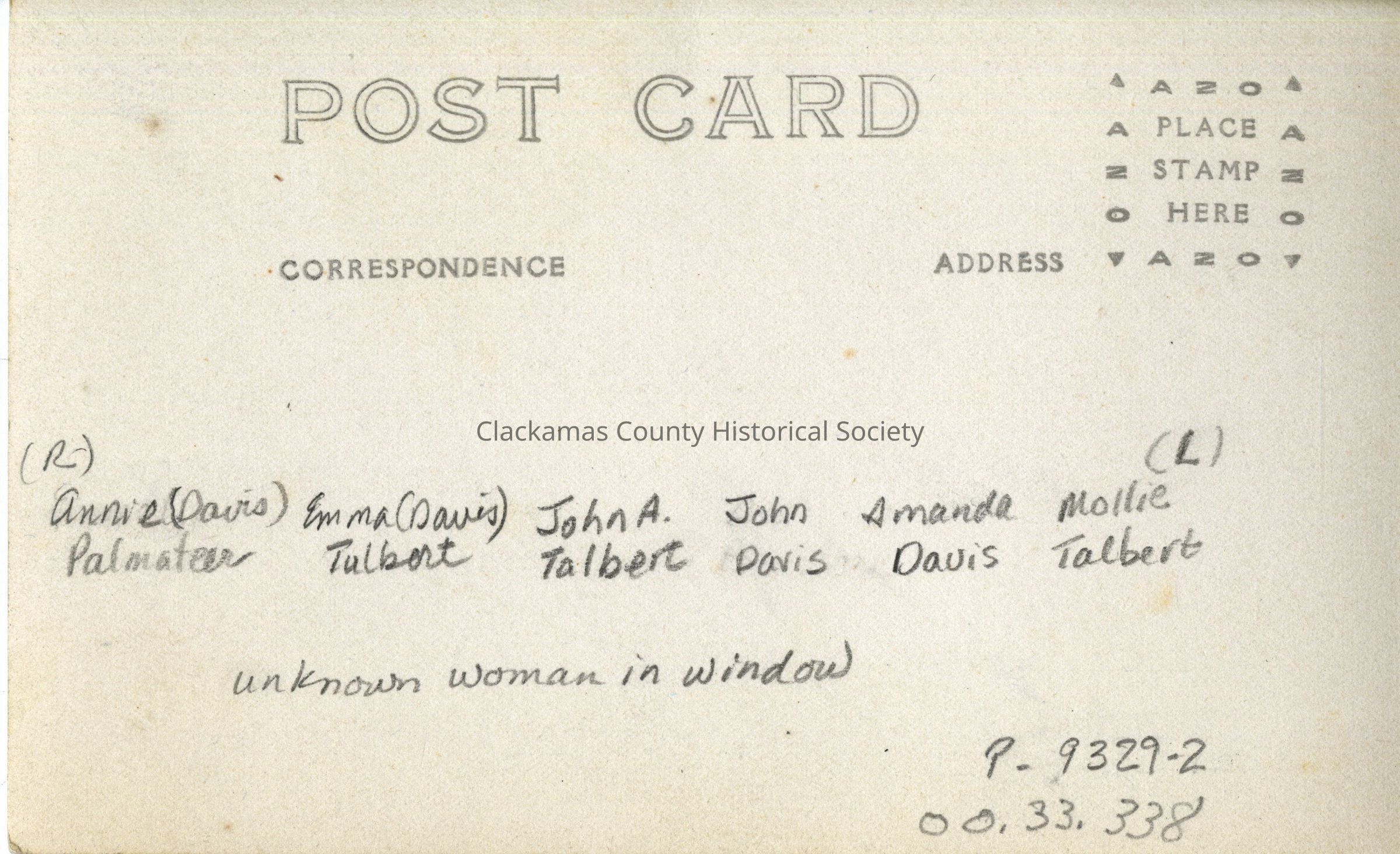 (l)Mollie (Mary) Talbert; Amanda and John Davis; John A. and Emma (Davis) Talbert and Anna (Davis) Palmateer (r). Unidentified woman in back near window.Other Names and Numbers