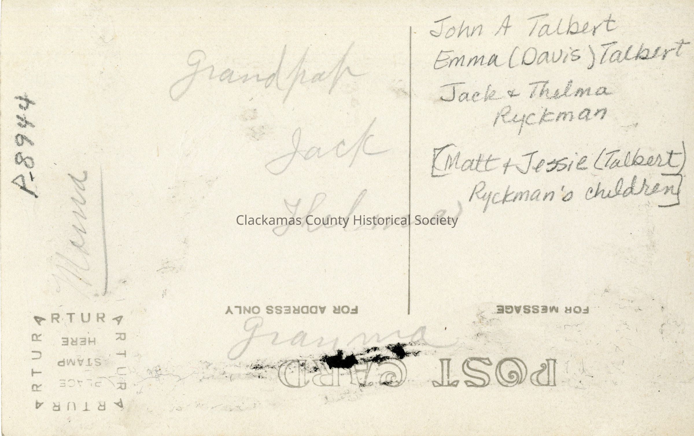 Photograph postcard of John A. and Emma (Davis) Talbert with grandchildren, Jack and Thelma RyckmanInscription/Signature/Marks