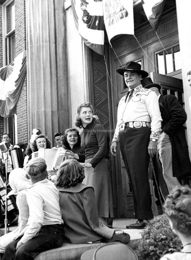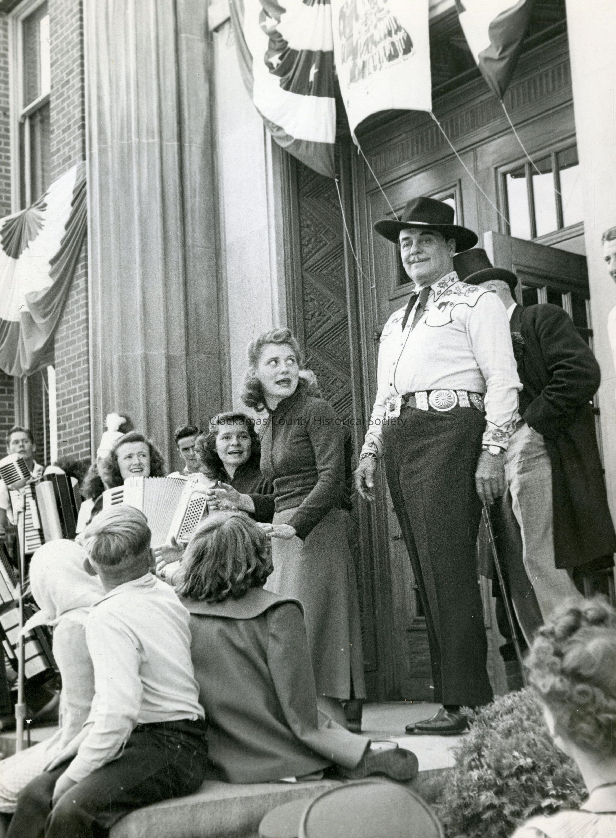 Territorial Days. Girl accordion players on steps of courthouse with TV/Movie Actor, Leo Carrillo, (Pancho of Cisco Kid fame).