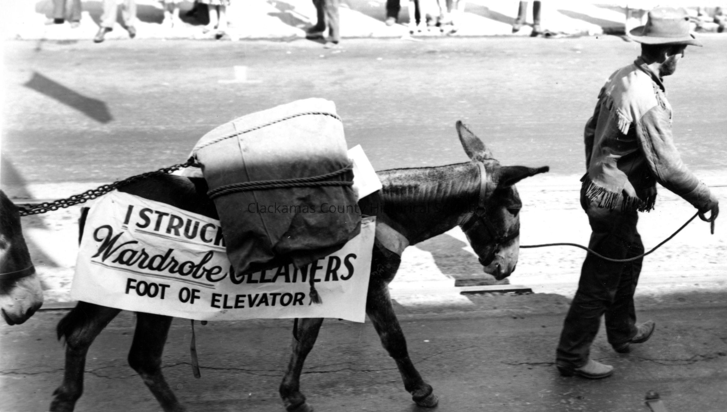 Territorial Days. 1976. Parade. Wardrobe Cleaners, foot of elevator. Man leading a mule with sign.Made/Created