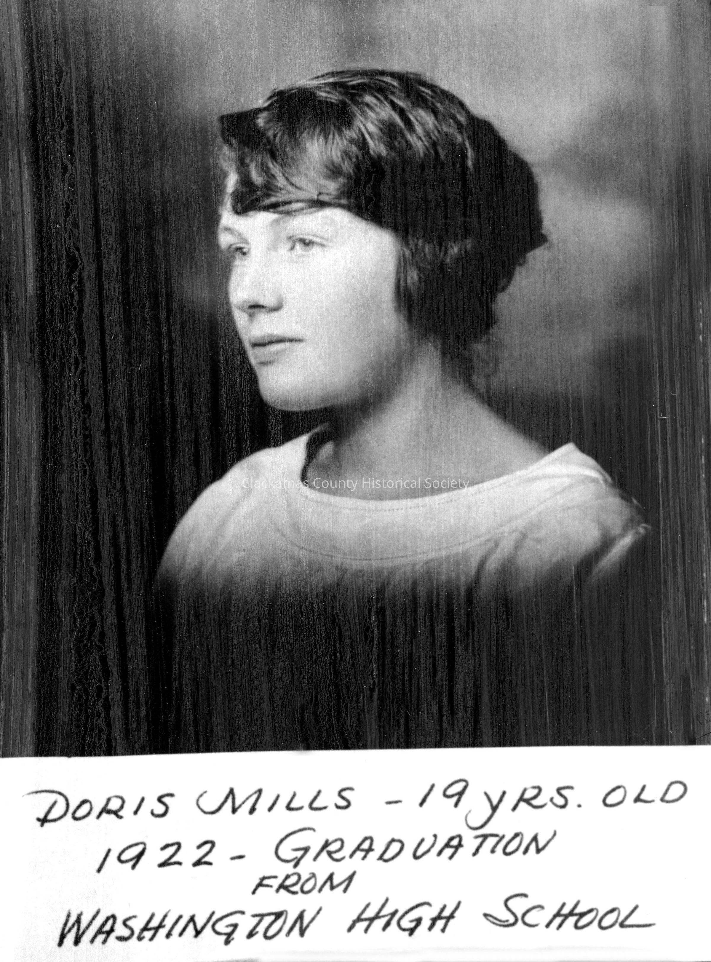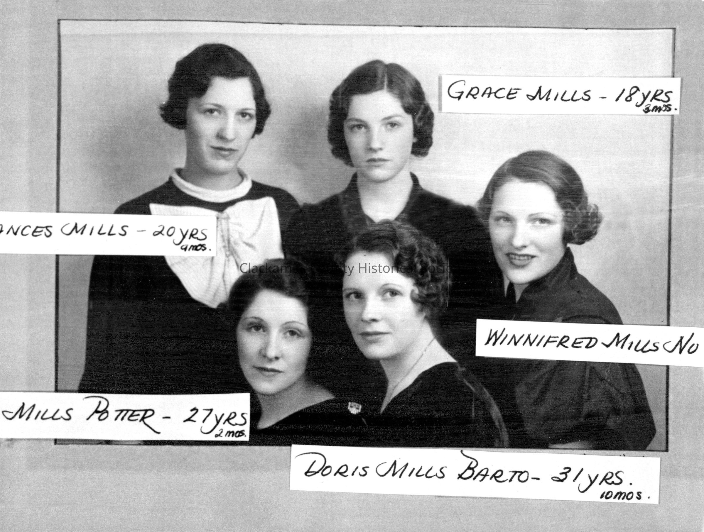 Mills Sisters Photos. 1A) Doris Mills as a baby in 1903; 2B) Doris Mills at 19 in 1922; 3C) Doris Mills Graduation photo from Washington High School in 1922; 4D) Group photo Frances Doris, Grace, Winnifred and ? Mills; 5E) 2 sisters later in life with ?.Made/Created