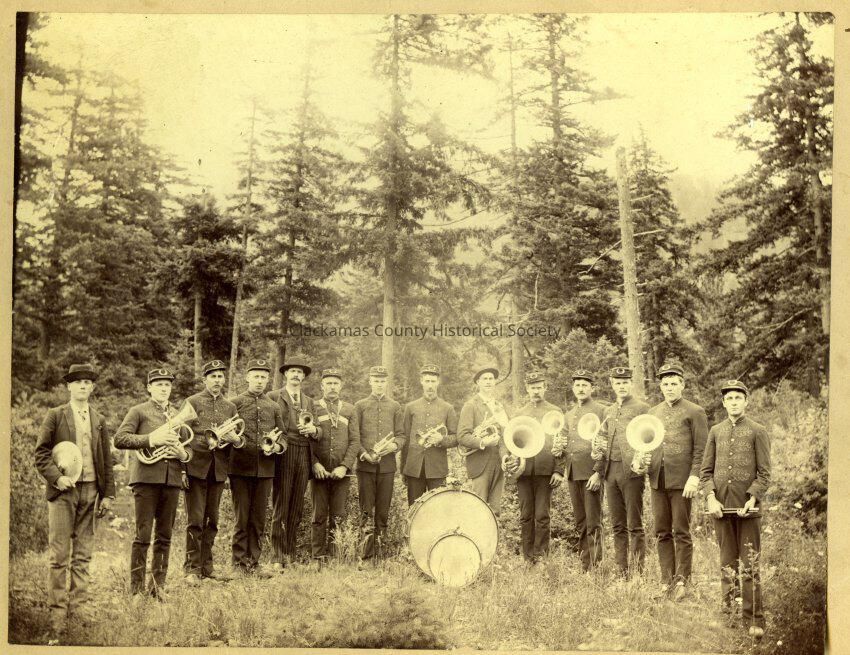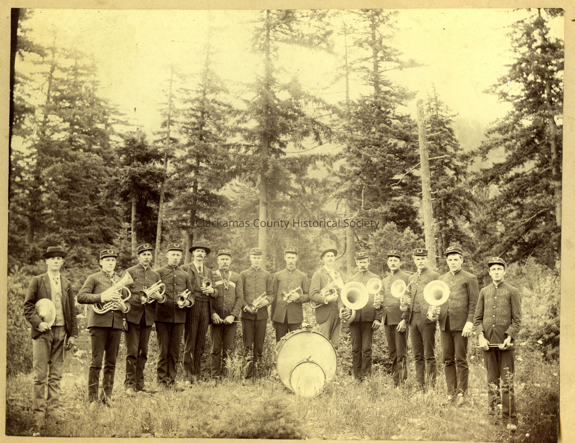 Drum in photograph on loan by same donor. 32" x 14" marching bass drum, calfskin heads, hand-milled brass claws. Maple hoops, mahogany shell. Date 1800's to early 1900's.Made/Created