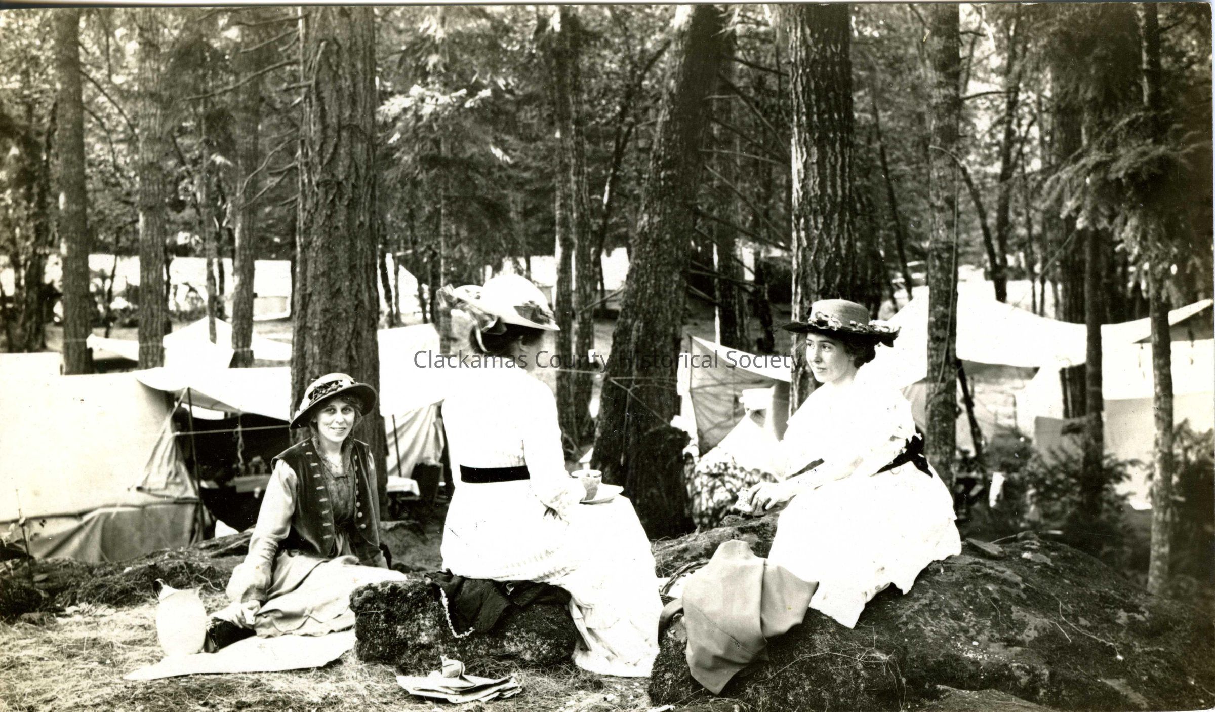 Picture Postcard showing three ladies at Chautauqua Camp. Back of photo postcard has the name June Charman written on it. June Charman is on the right.Made/Created