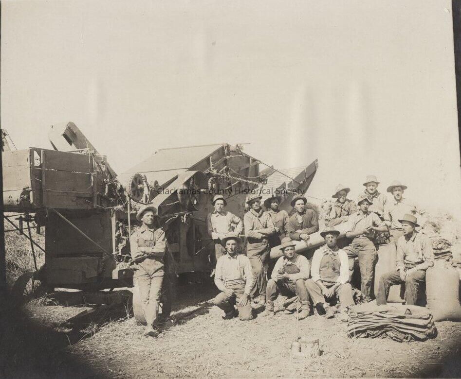 Threshing machines and Harvest Crew Crew with grain sacks Farm Scene