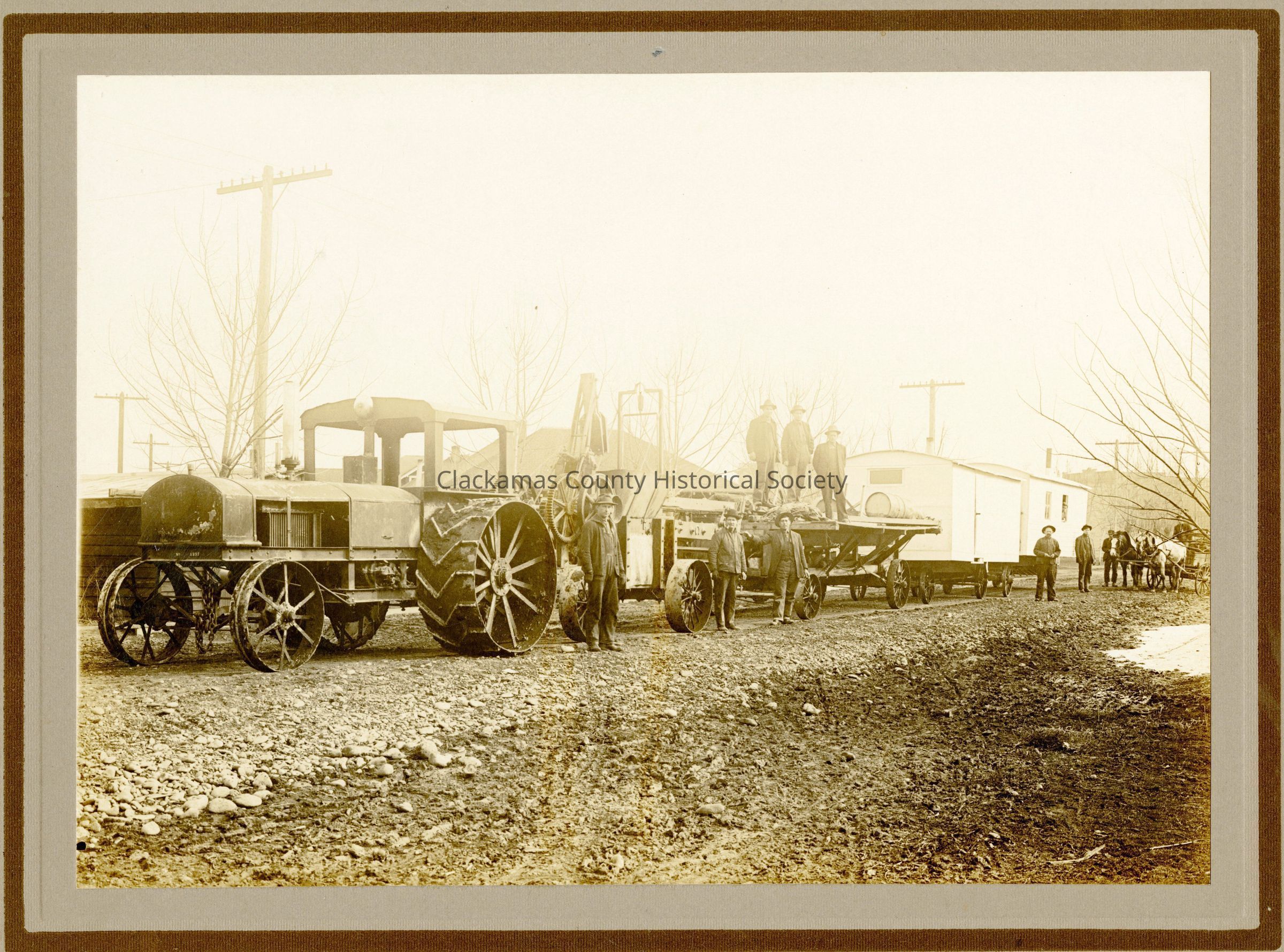 Steam threshing tractor attached to equipment. Several small buildings in line. Men standing in along front of photograph. There is a horse drawn wagon on right side of picture.Other Names and Numbers