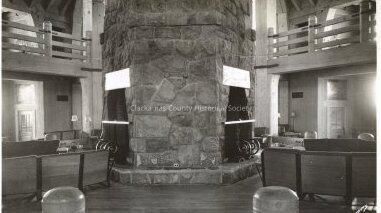 Interior, Main Lounge, Timberline Lodge 1940s featuring fireplace. Postcard. No text on reverse.